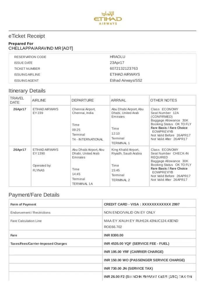 Feedback: Hi this Aravind Chellappa booked ticked(Ticket no:[protected]) on ur airways on 23 of this month for the travel date of 26-4-17. In my ticket it was mentioned that it was confirmed. Boarding at airport ur officers said ur ticket status was in no go, and to clear that they need some documents like ticket, passport, card details and all. I forwarded that all in E-Mail to ur concern(mail Id - [protected]@etihad.ae). And ur officer conformed that this will be processe min 12hrs and you will get a ticket in next flight to the destination. Evening time they called me and asking 26000 to travel in next flight. What kind of method is this I can't understand. For me you conformed the ticked while booking, and u asked for documents while boarding and I forwarded that too. Now again you are asking me to pay 26000 to travel. Where is my fault here? why I have to pay 26000? I delayed my works there by 1 day because of ur faults, I accepted that as a coordination. Now this 26000 also have to pay for your faults. What kind of system is this. I need a ticket in next flight, I can't wait here for a week for your faults. Attached all documents for your reference and quick respond. Arrange the things ASAP.