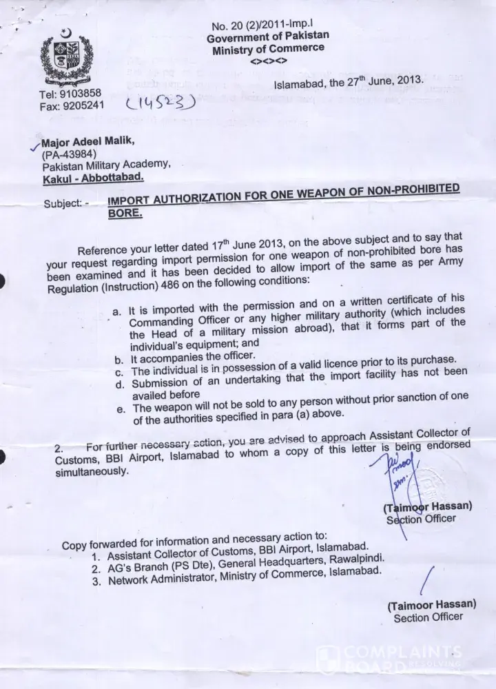 I am Adeel Malik and i was selected to attend a military course in United States of America (Fort Gordon, GA, 30905). Before proceeding for the course, I sorted the permission of Ministry of Commerce Pakistan in order to import a weapon for personal protection, which was given. I processed the case through my Defence Attache in USA in order to obtain the State Department approval for import of weapon (DSP-05) which was approved and i was given the license number [protected] on 12 June 2013.