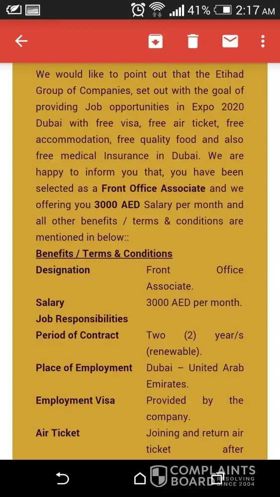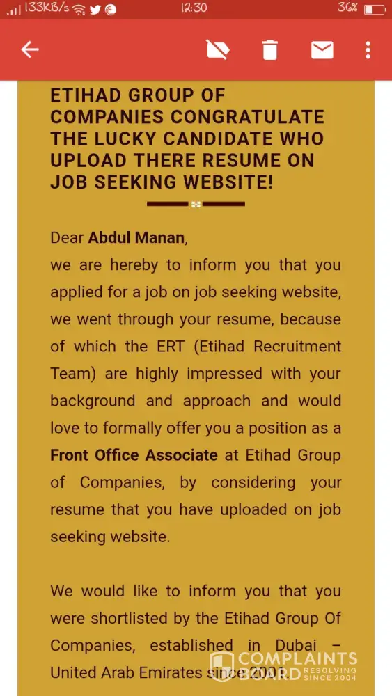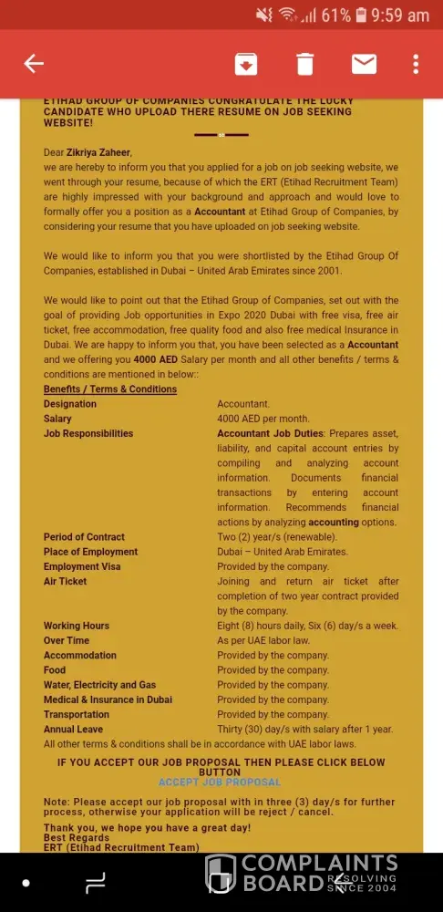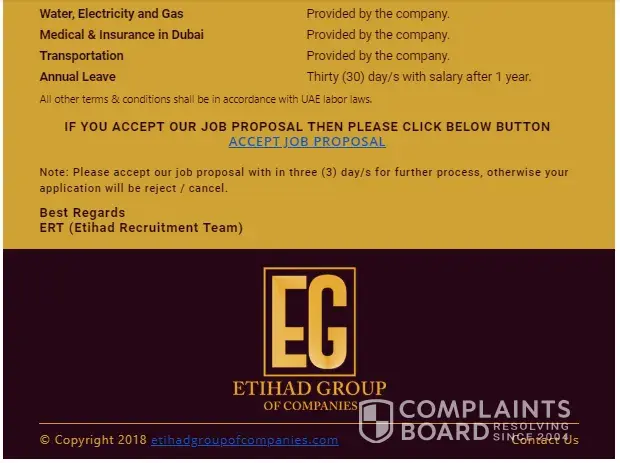 I'm from pakistan and today i received email job offer from etihad group of companies and also an sms on my cell number to check the mail they sent to me.There was a contract offer for me to do the job of Assistant supervisor within salary they are willing to pay me 4500AD monthly with all many company employee benefits.They mentioned that the job designation is affiliated under the project of dubai expo 2020.The salary doesn't match with the posting and i am also a fresh graduate in civil engineer.Therefore i checked on internet social media and found mass of negative reviews.There is no one got appointed that i may had verified now.I found it my duty to report it towards ISPR or FIA in pakistan to stop these scams of detaining personal information for illegal purposes.