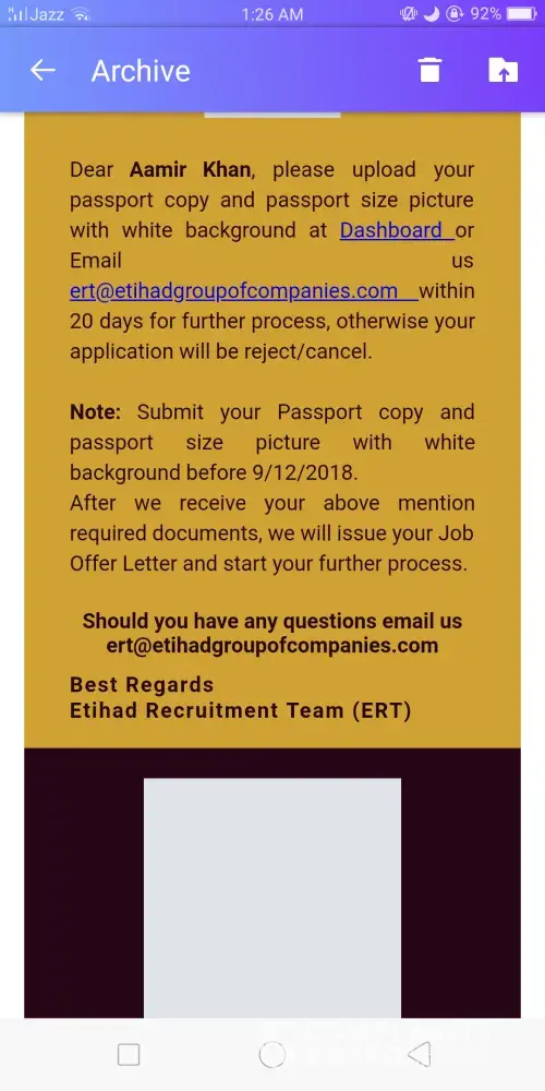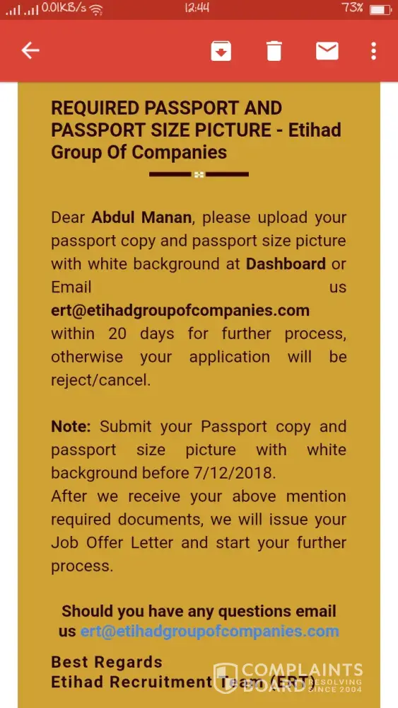 Hello sir.. I received a job offer from etihad group of companies, for the post of Assistant supervisor, they are offering me 4500aed. With all facilities provided by company.. They demanded me passport copy and photos to upload on their website for the further process.. Kindly tell me is it fake or real... I received email and also sms on my cell number about job offer by etihad group of companies. Pix are attached about details of phone number from I received sms. And I received email from ([protected]@etihadgroupofcompanies.com)