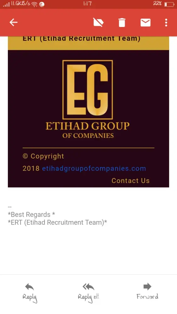 Kindly tell me is it fake or real... I received email and also sms on my cell number about job offer by etihad group of companies. Pictures are attached about details of email address from which I received Email. And I received email from ([protected]@etihadgroupofcompanies.com)
