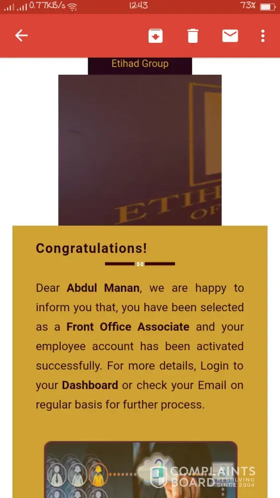 Hello sir.. I received a job offer from etihad group of companies, for the post of ACCOUNTANT, they are offering me 4000aed. With all facilities provided by company.. Kindly tell me is it fake or real... I received email and also sms on my cell number about job offer by etihad group of companies. Pic is attachef, I received email from ([protected]@etihadgroupofcompanies.com)