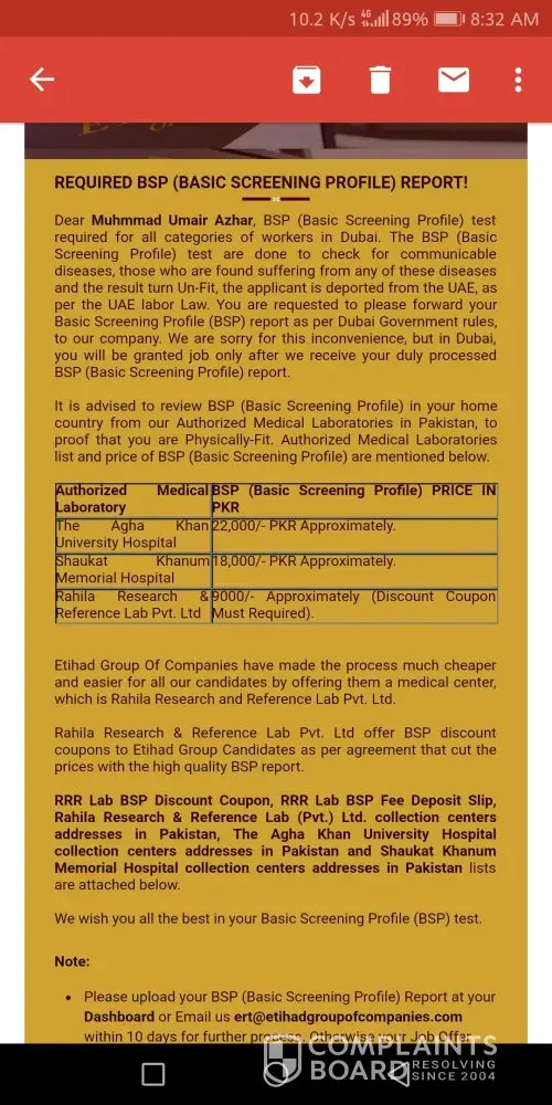 i am sure that rahila lab is connected with them in pakistan becouse they etihadgroup of companies refered this lab in pakistan and there is lot of rahila labs they all sure that there is no fake in this web there is orignal process by rahila staff then why government of pakistan not taken any action to baned this lab in all over pakistan. they all involve and want to taken Rs.9000/- from each Candidates from pakistan by testing basic screening report i have got the reports total 4000 pepoles spend theire money on behalf of medical fitness report. All rahila staff should be arrested in pakistan and pakistani government take serioully action in this regards and all charges of lab test should be return to all Candidates.