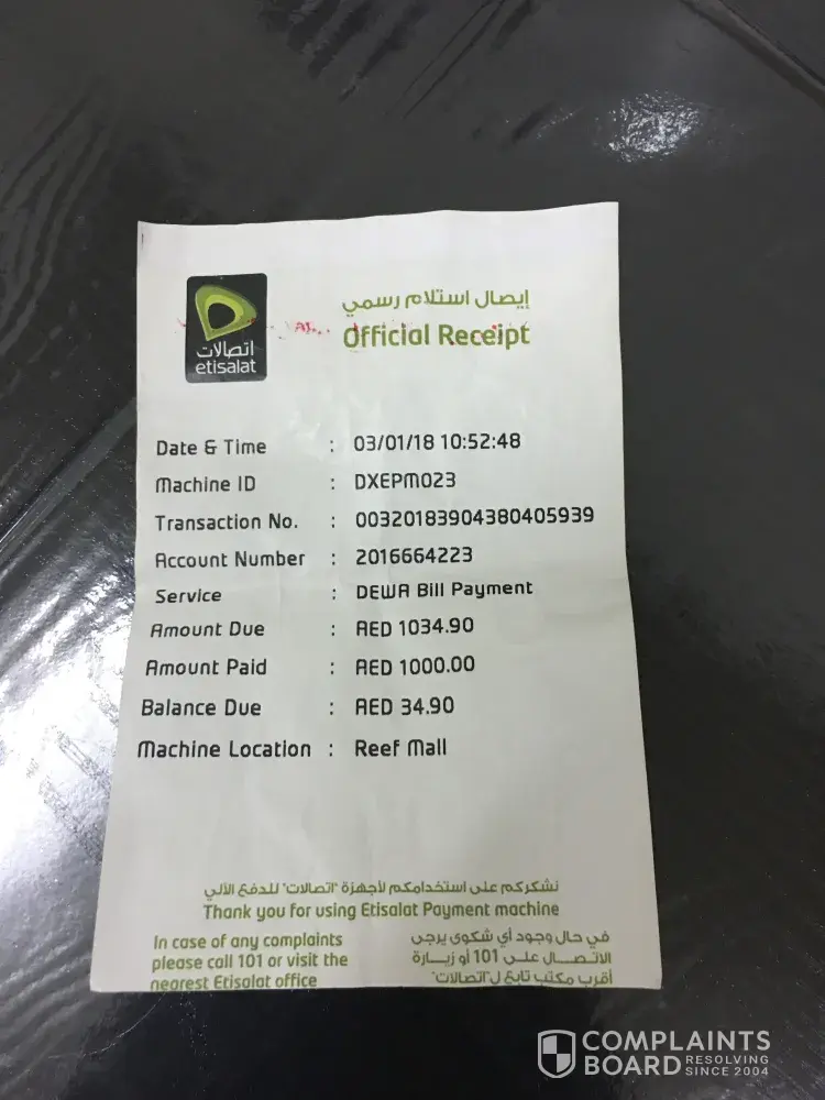 I paid my dewa bills in etisalat machine branche reff mall last 3/1/ 2018, i have the receipt however the payment was not sucessfully credited to my dewa bill, so i decide to call etisalat and they advise me to contact dewa, dewa customer service advise me to sent them email with attached receipt and my emirates id, whic i did, i receive an email to dewa that my inquiry is already sent to the concern department whic is etisalat, and it will resolve within 5 working days, but till now is not yet resolve my new statement in dewa is already generated my previous month bill was added already whic is alraedg paid, why it takes so long to sort it i have the receipt that the money was in etisalat they should resolve faster..