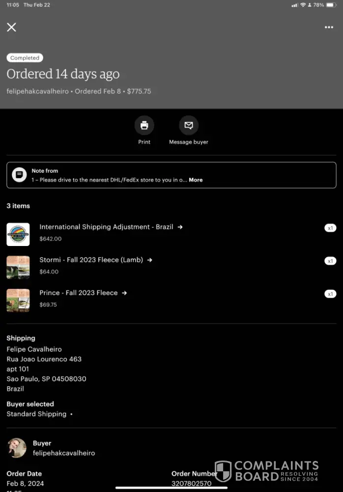 On Feb 7. 2024 I was contacted thru Etsy messages by Felipe from Brazil who wanted to purchase 2 of my fleeces from my Etsy site. However, he wanted me to use Fed Ex or DSL as the postal service is not reliable. I spent quite a bit of time packing and contacting the shipping options he requested to determine the best price. Shipping alone was $642. He agreed to pay it. To make the transaction as easy as possible, my daughter added the fee to his order and specifically labeled it INTERNATIONAL SHIPPING. (Please see attached images)