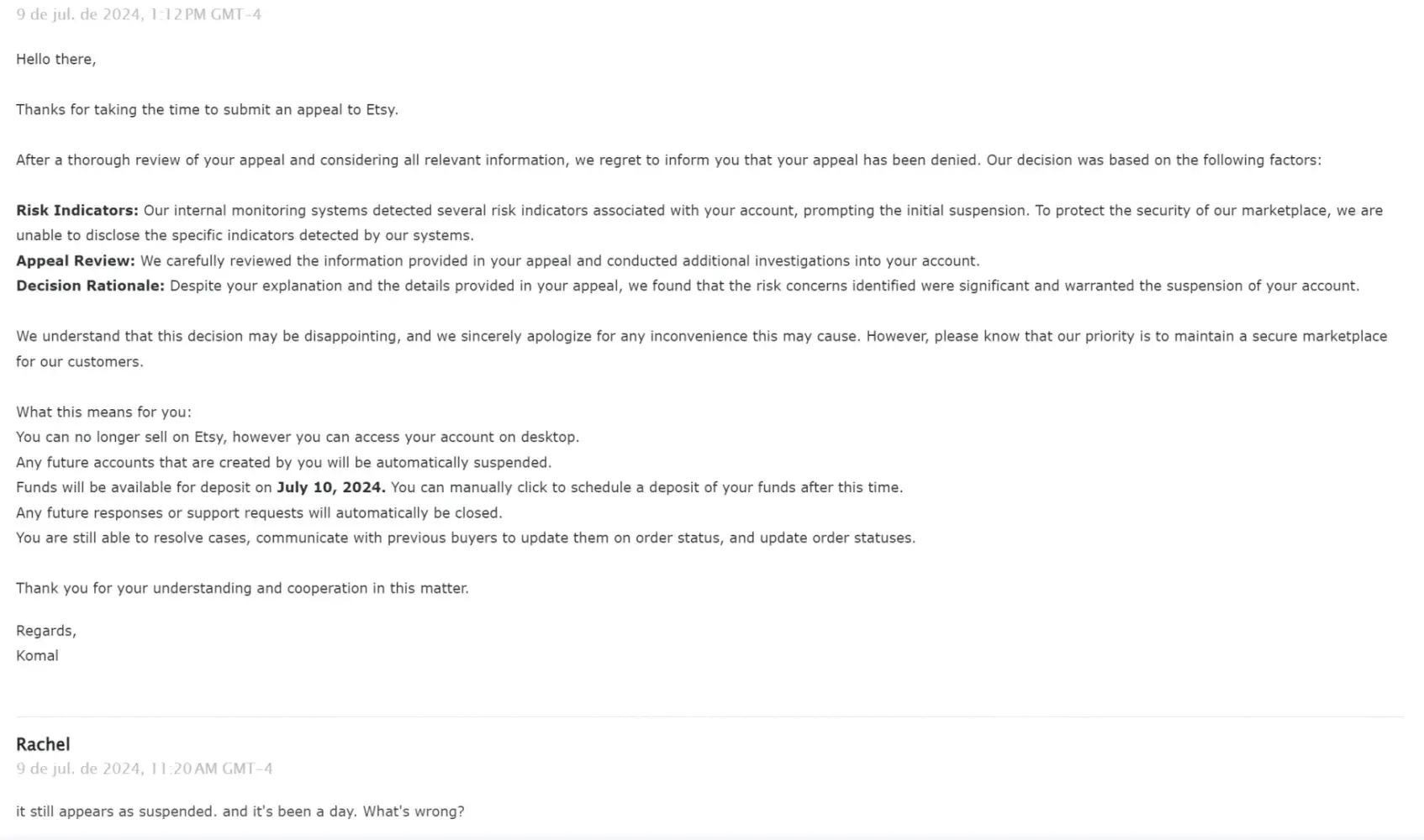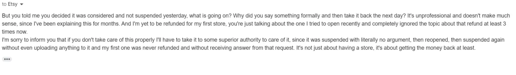 I was a seller on Etsy and then my shop was suspended that was 3 months ago I have emailed them several times no reply, I have appealed 7 times still nothing, they will not release my money does anyone know what else I can do? they. have £400 of my money which have put on hold?