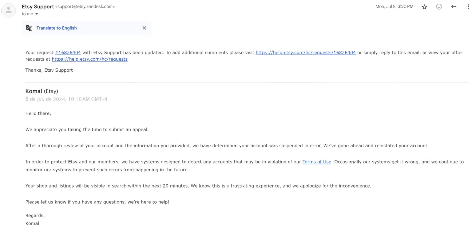Etsy’s Terms of Use, to which the Customer agreed, state that Etsy “may terminate or suspend your account (and any related accounts) and your access to the Services at any time, for any reason, and without advance notice.” When we take action against an account due to policy violations, this affects all accounts operated by the member.