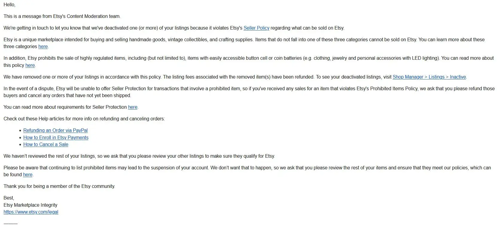 Etsy terminated my account alleging a violation of a policy that allows other sellers.