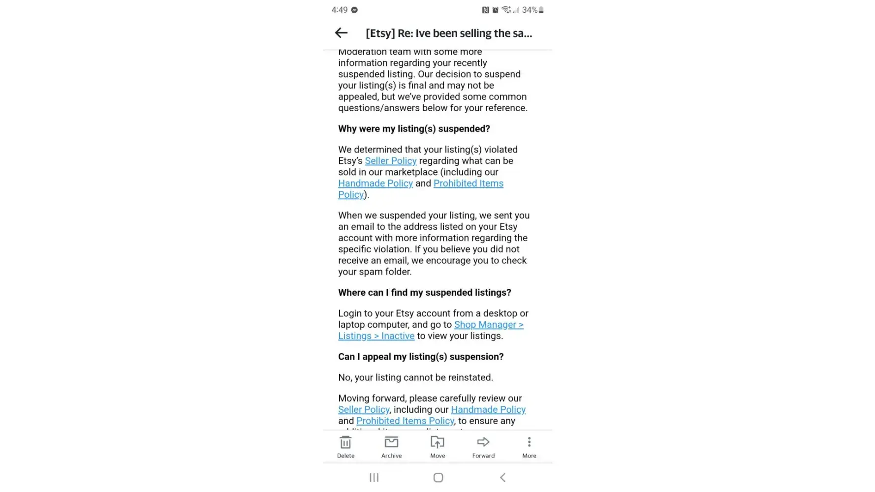 I have been on etsy since 2012 with no issues. I have been with you all through highs and lows. if you felt something i was selling isnt sellable then remove that post not my entire etsy. I have worked very hard and now all down the drain. You all treat small business owners so bad and customer service doesnt no anything. just horrible. They never Said which listing.