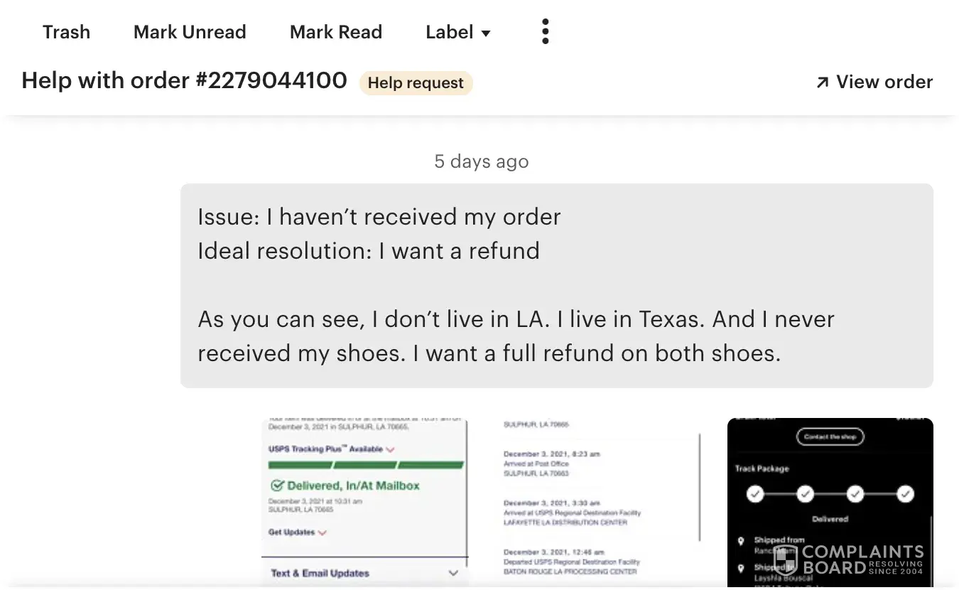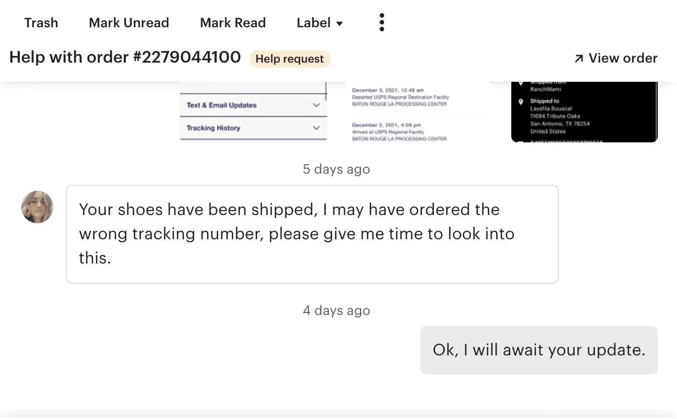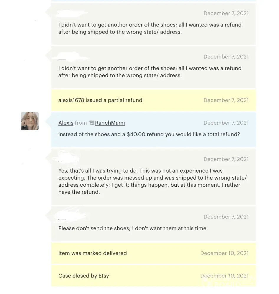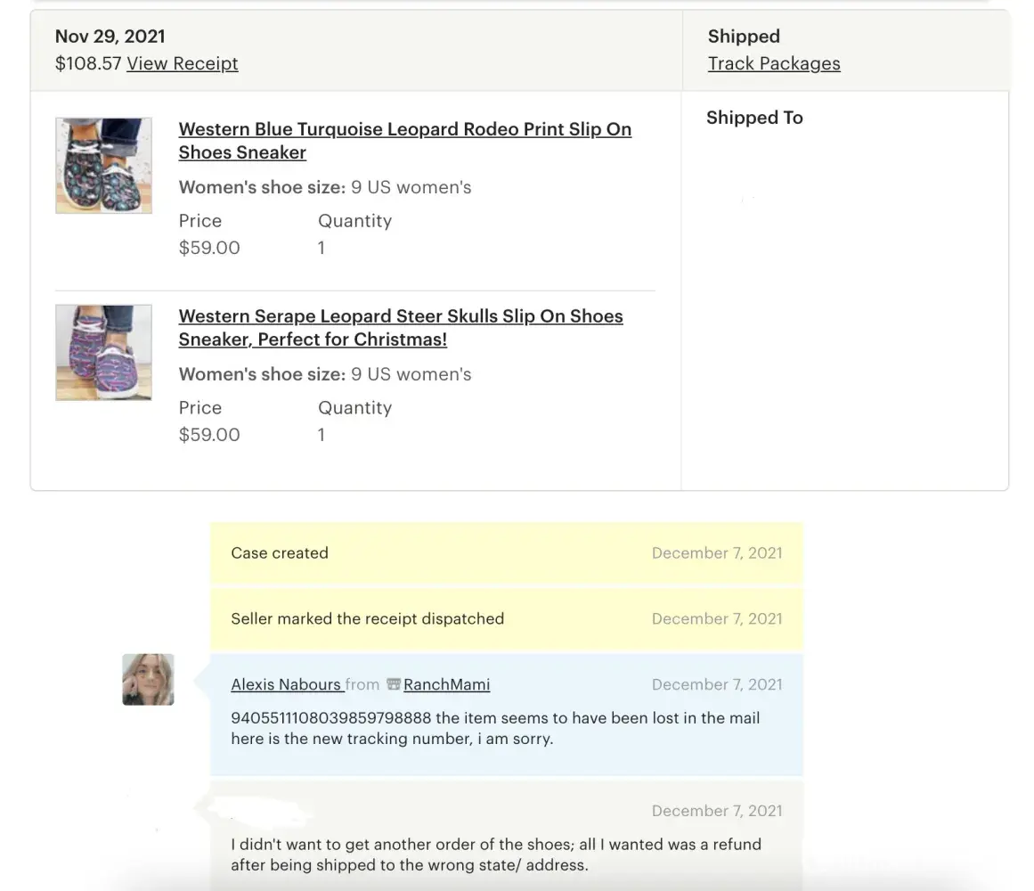 So I order some shoes off of Esty, her store name is RanchMami, and I believe this person works for them. The first order of shoes never came to my house; she claims the shoes were lost in the mail. So I asked if I could get a refund. She refused to give me that and ignored me until I opened a case against her. Next, she ignored me again after I told her I wanted a full refund, and instead, she ignored me and said I would give you partial credit, and I told her no, I wanted a full refund. So she abused the power of Etsy and shipped the shoes anyways and is now refusing me to return the item.