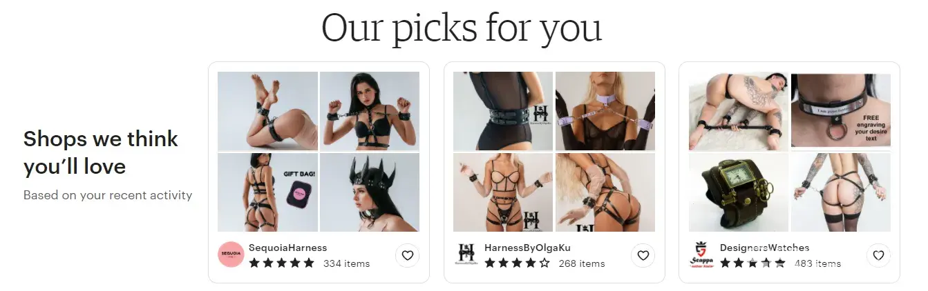 I posted several unlined vintage lace mini dresses and top I designed meant to be worn with the undergarment preferred by the buyer. From these posts, Etsy has inserted several exotic sexually explicit shops on my Marketplace page along with dildos inserted in a Green Bay Packers page I looked up. It is disgusting. I am a 78 year old great grandmother and I am appalled.