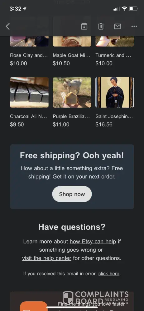 I bought some goat soap I have been wanting . Got an email saying my next purchase would have free shipping. I clicked the free shipping link and tried to purchase a few more items and eEtsy continued to charge for the shipping . Needless to say I decided not to purchase anything else since the advertised free shipping was not true . False advertising.