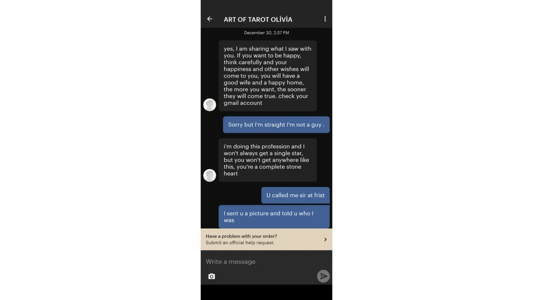I want to report a seller on Etsy.i ordered a card reading and she messaged me calling me sir after I had sent her my information that I was a women including a picture.i correct her that I was a women .she started telling me stuff which I didn't appreciate it.i just want a simple card reading.i sent a screenshot of the seller porfile.