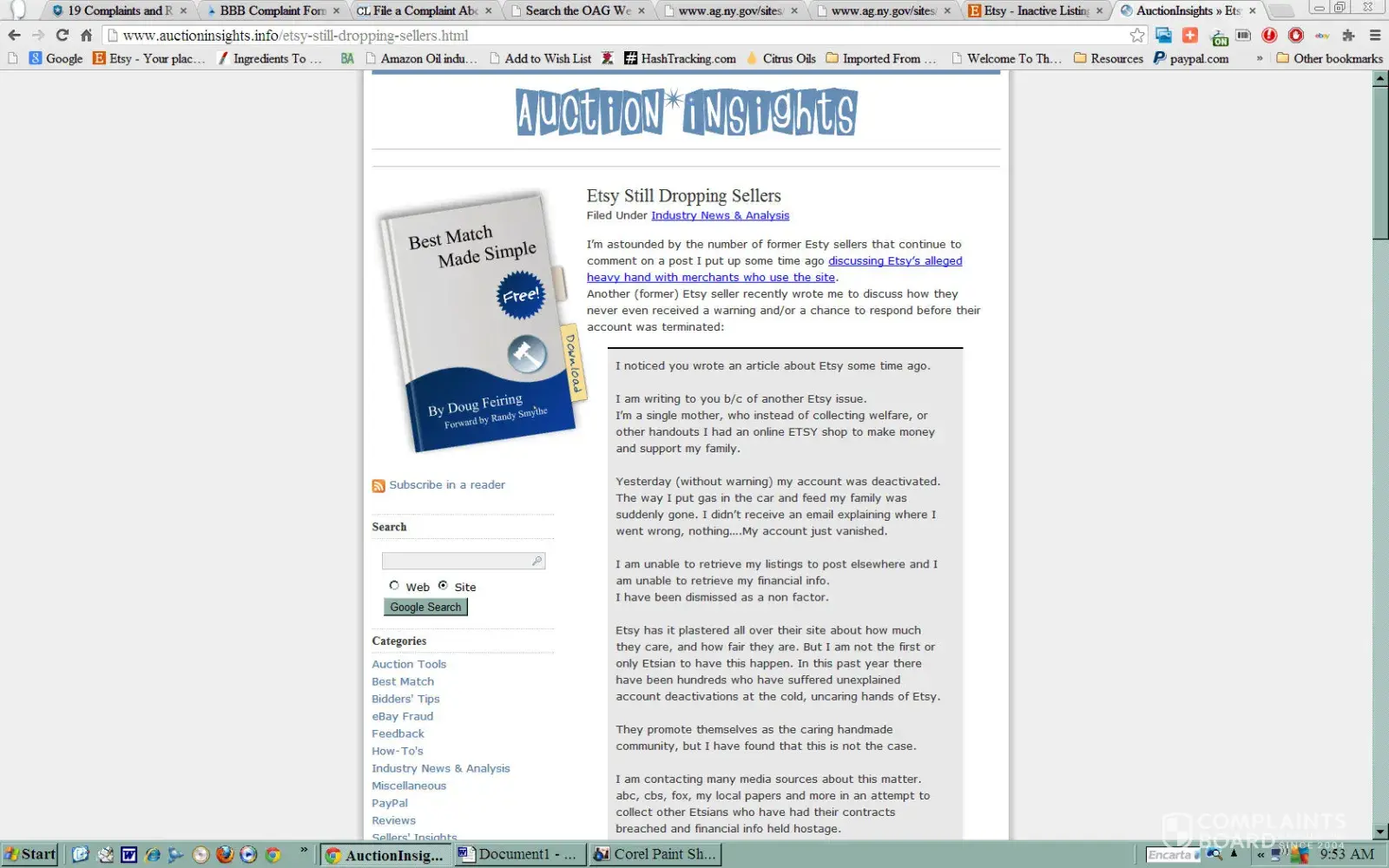 Etsy closed my account permanently when I complained about undeserved Negative Etsy Feedback from an Internet thief and scam artist (see Shalane Doucette, or [a/k/a] ‘Lanie Bulzachelli, ' and/or (Palace Cats) ‘palacecats, ’ PalaceCats, Inc., 7206 Jasmine Road, Fort Myers, Florida, USA). When I complained, they suspended my account for a month. I kept my Etsy Listing Fee bills current, even paying for the month my account was suspended. When I complained again, they disabled my account, closing it permanently. While researching Etsy's rules and regulations, I discovered that Etsy has gone from the "hand-made" only sales website to something that resembles Ebay, for resellers only, selling trinkets, and although these trinkets are "hand-made, " they are hand made in a China sweatshop on an assembly line. I was originally disappointed with Etsy, but there are many other Internet websites (NOT Ebay) that surpass Etsy's traffic volume, hits and sales! Internet websites such as 'Bidstart, ' "Zazzle, " "Froogle, " "Yahoo!" These websites promote your sales items better, get more traffic and hits and they are not unscrupulous, like, unfortunately Etsy has become!