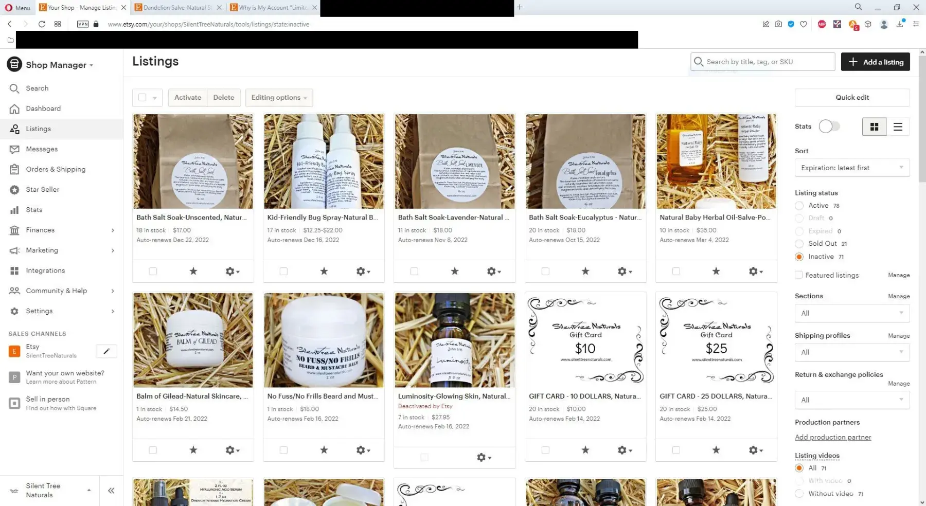Other actions perpetuated by Etsy against my shop...Etsy randomly "deactivates" listing, stating that I am making "medical claims", which I do not. I am very careful with my wording. What makes matters worse, is there are Etsy sellers who actually DO make medical claims but they're product listings are still live and they are making a lot of sales, to boot. Why does this rule only apply to my shop?