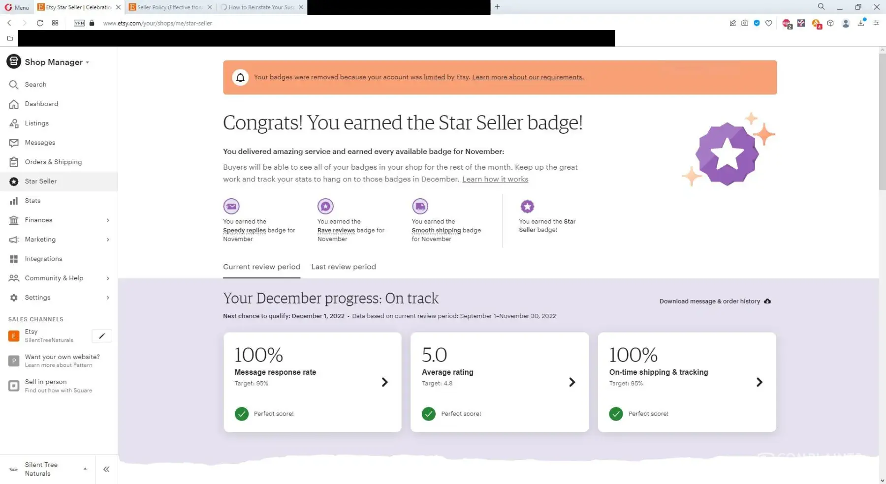 I was stripped of my earned badges and hidden from searches. I didn't just lose a month's worth of views, sales and potential future sales, but exposure at the biggest shopping time of the year!