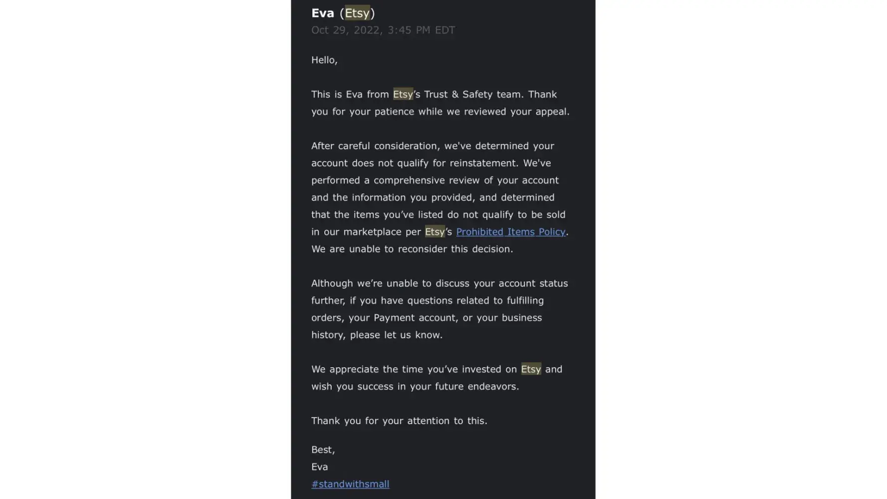 Etsy have done this to sooo many businesses it’s astonishing. Post this on seller support pages on Facebook because they are flooded with Etsy shutting them down unfairly. I’ve also been one of those people whose lively hood was depending on the income. I now have another store on Etsy but on edge as they have already made mistakes to harm my store. Such as refunding customers because their bank account seemed suspicious after I made a personalised product. Suspended my account because there was a technical error. I have all that in email. To get hold of them is so hard and you have to go searching hard for a contact. They need to accountable for so much yet they are playing some kind of dictator role and it needs to be stopped.