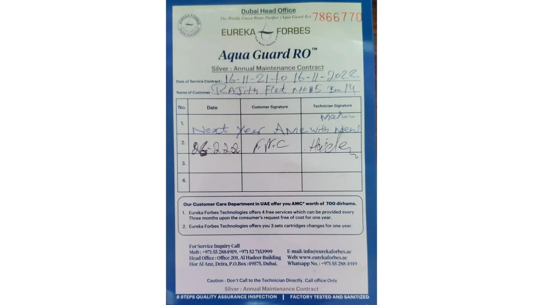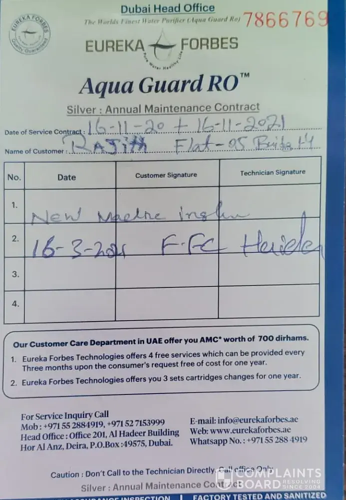 Eureka fobes company cheated me, I bought 9 stage purifier on 16 November 2020 with 2 years maintenance contract and they done only 2 services in these period. my contract is finishing on November and they want to me to renew this contract. getting slow water and now saying that need to replace tank with AED 700. they are misleading people and trying to get continue contract and getting money. so please do not buy from them. Now I am trying to complaint in Dubai consumer court.