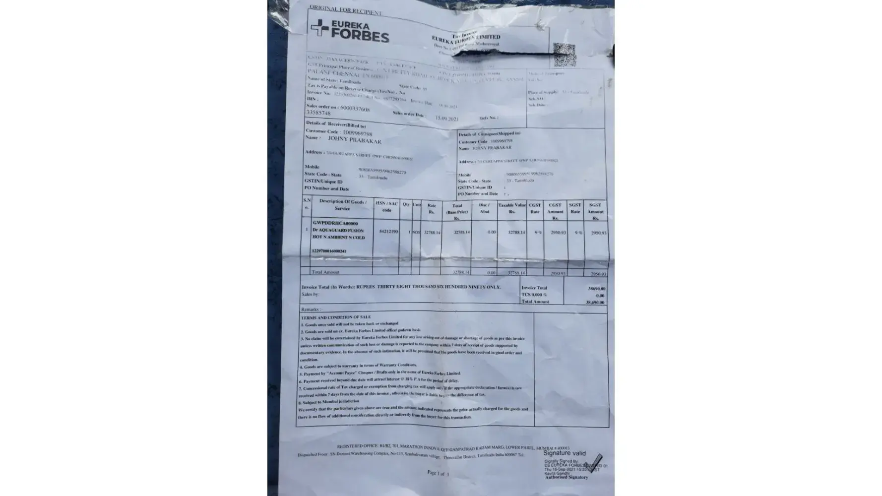 Approximately 2 weeks back the purifier's body cracked due improper installation and weight on one side. This was informed to us when we booked a service and the technician visited on 3rd Sept 2023. He and myself had then lodged a complaint with Eureka Forbes and Service Center to replace the item.
