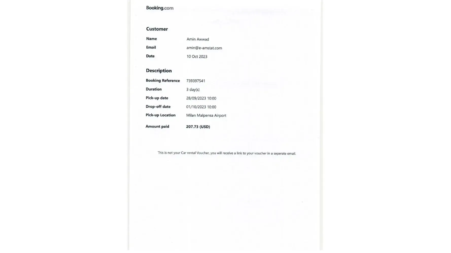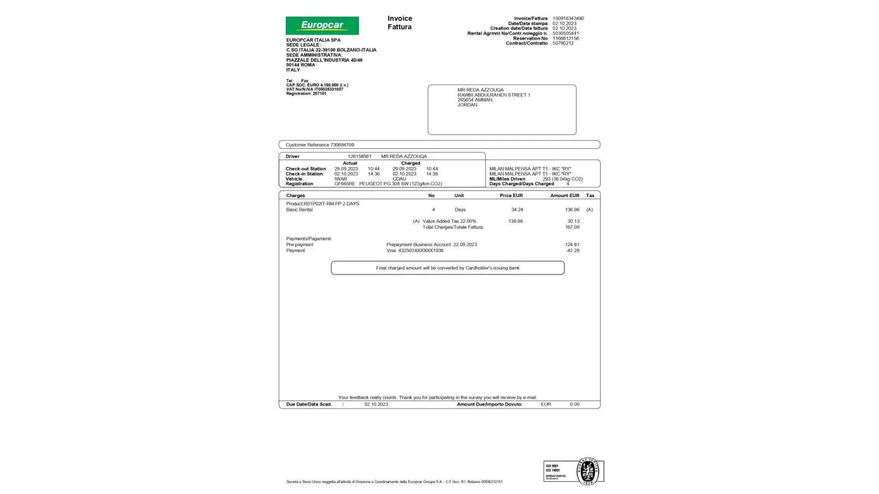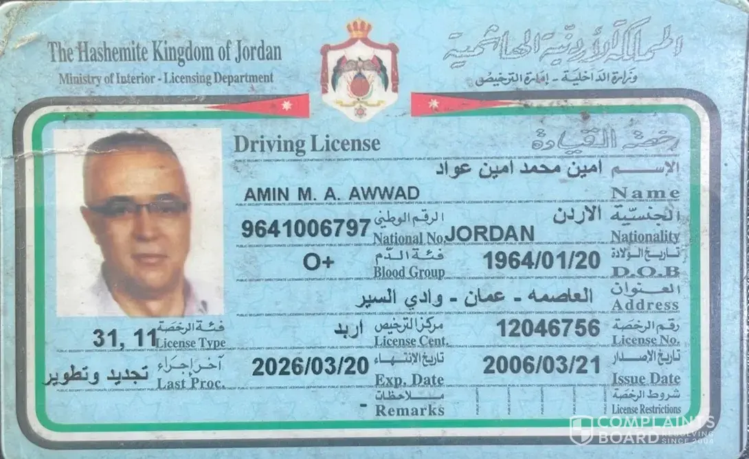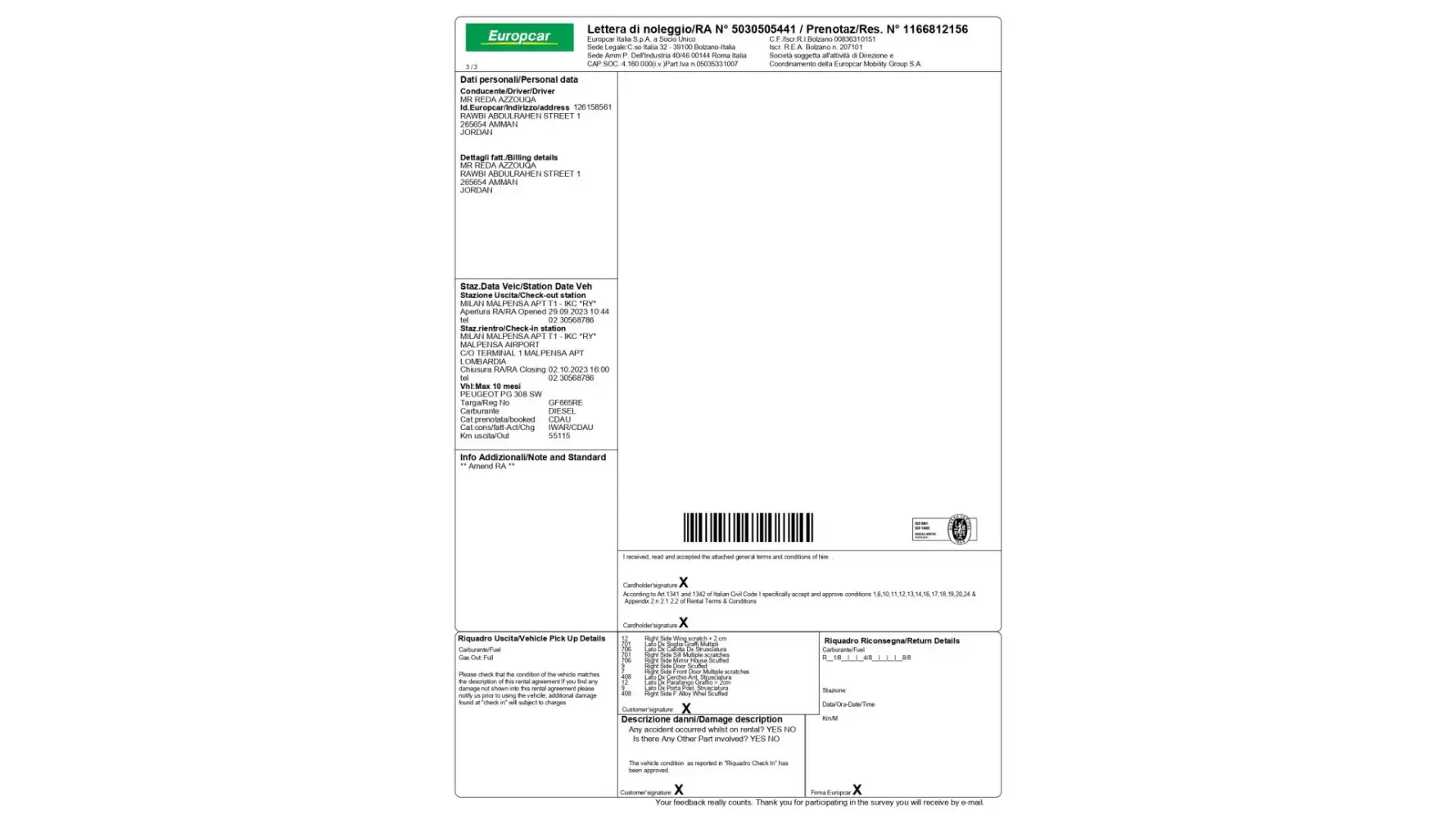 I presented to the Europcar rep at MXP AP in Milan on the 28th of Sept at 10:00 am and was denied service despite providing my attached valid driver's license which contains all my details in English. (Exhibit 2.1 attached) where I was informed that I had to provide an International Driver's license as well as my Jordanian driver's license. I tried to explain that this was not a requirement by Europcar or any other car rental agency as my license is valid and contains all my details in English characters ( Please see the attached Exhibits 1.1, 1.2, 1.3 and 1.4 with my friend REDA's details who presented to the same Europcar desk at MXP AP and used an identical Jordanian driver's license that was honored and accepted without the need for an International Drivers license)