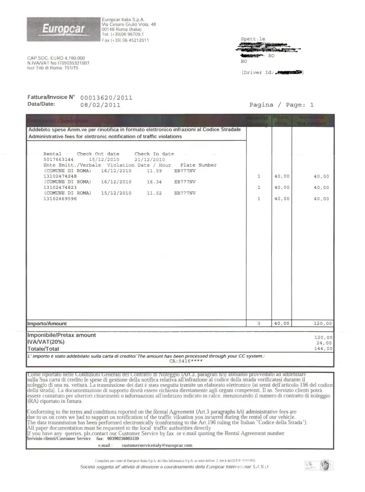 After 2 months, I received an invoice from Europcar for administrative fees for electronic notification of trafic violations ! of 144 euro, for 3 traffic violations in Rome, 2 of them in the same day (see Foto).