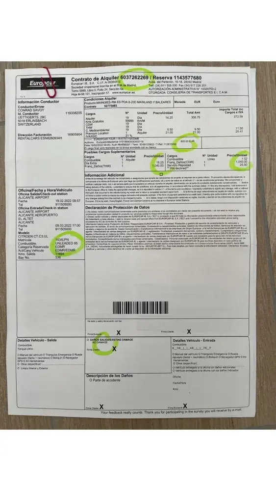b. Damage Surcharge: 181.50 Euros. For what exactly? There is no explanation there. I called for the damage I noticed.