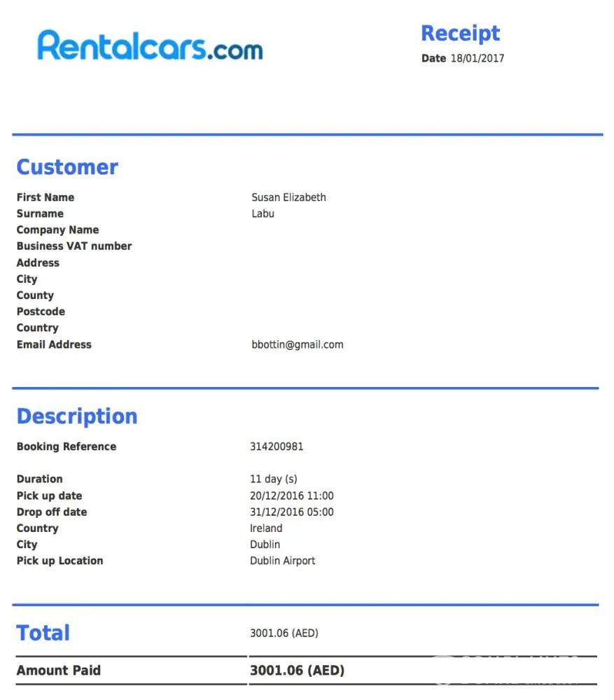 We booked a rental car though www.rentalcars.com in November 2016 for our holiday end of Dec 2016 in Ireland. We paid AED3001.06 which was for a Toyota Avensis and included full protection. When we arrived in Dublin on 20 Dec 2016, Europcar told us they they don't have this car for us, but can give us a Hyundai ix35, and will actually be cheaper than the Toyota we booked.