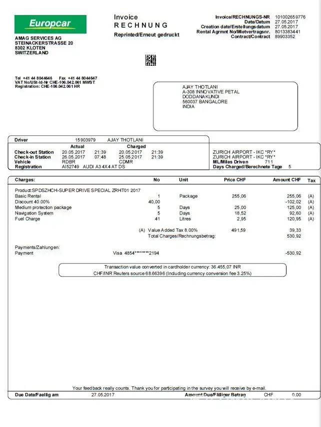 ii) Price of diesel in Switzerland is not more than 1.5 CHF but they have charged at 2.95 CHF per liter which is double the charge.