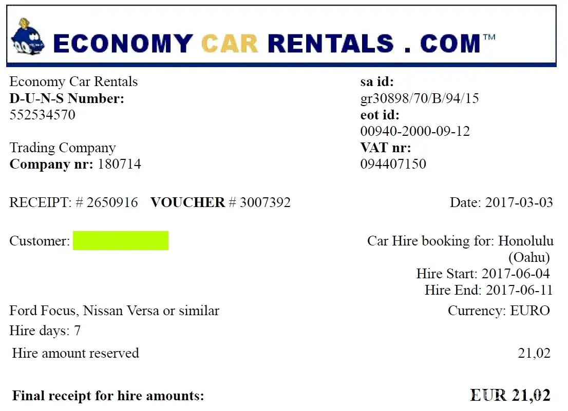 My booking and deposit were paid to Economy Car Rentals but my e-voucher 3007392 lists Europcar as the “car rental providerâ€.