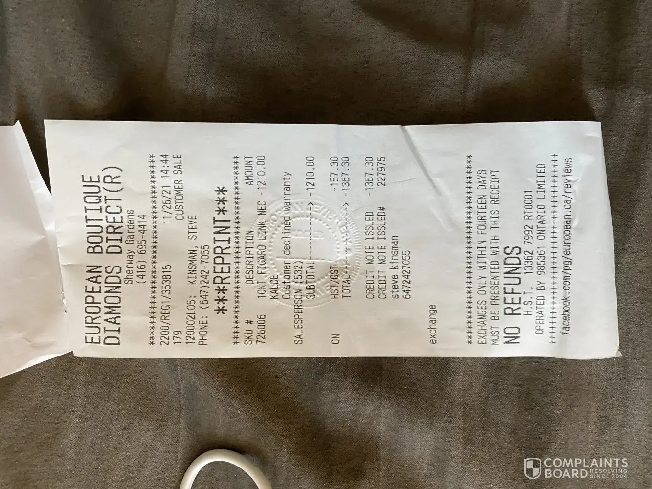 I will never shop at European Jewellers again due to this very poor customer service experience. And I'm happy to warn others about shopping there too.
