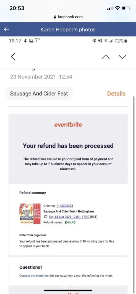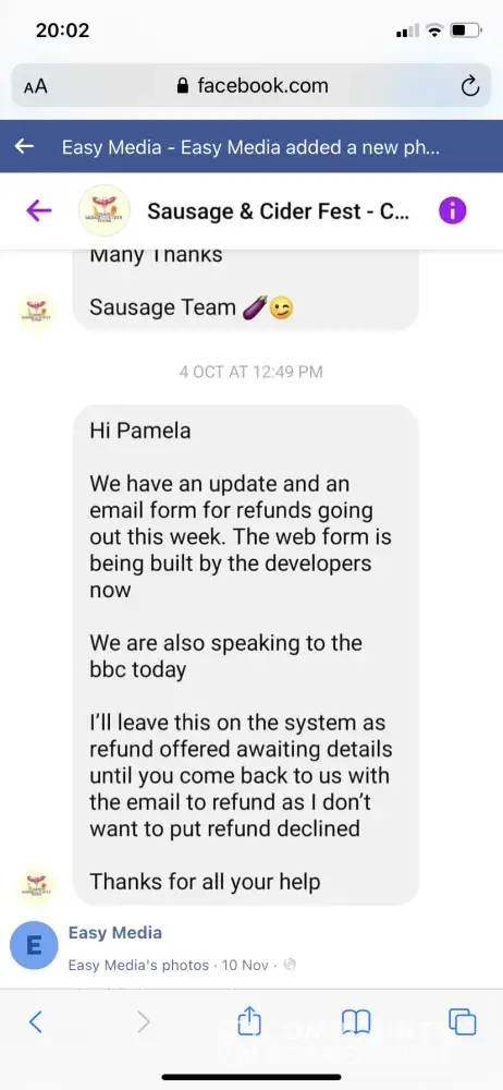 I am writing to inform you of my lack of support and acceptance of refund requests. Several emails to organisers of the event with no success or replies. Only reply I had was that ‘they do not give refunds' despite the original tickets being purchased two years ago! Event still not confirmed or attended!