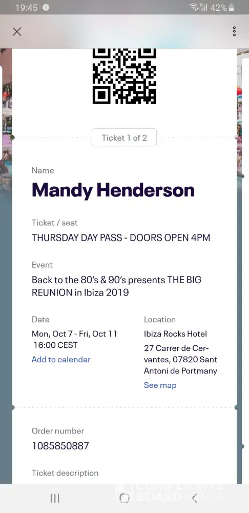 I purchased 2 tickets for the above event for My Daughtets Birthday as a surprise (only reason I booked Holiday to Ibiza) It was to see her idol Ian Van Dahl we arrived at the event and spent 2 hours listening to Jive Bunny James Dean and Lasco to be then told that Ian Van Dahl was u able to attend and she was the headliner for this event. My daughter was extremely upset and I found this to be a waste of money as we left after the announcement. I'm wishing to be considered for a refund as this wasnt the experience I had paid for.