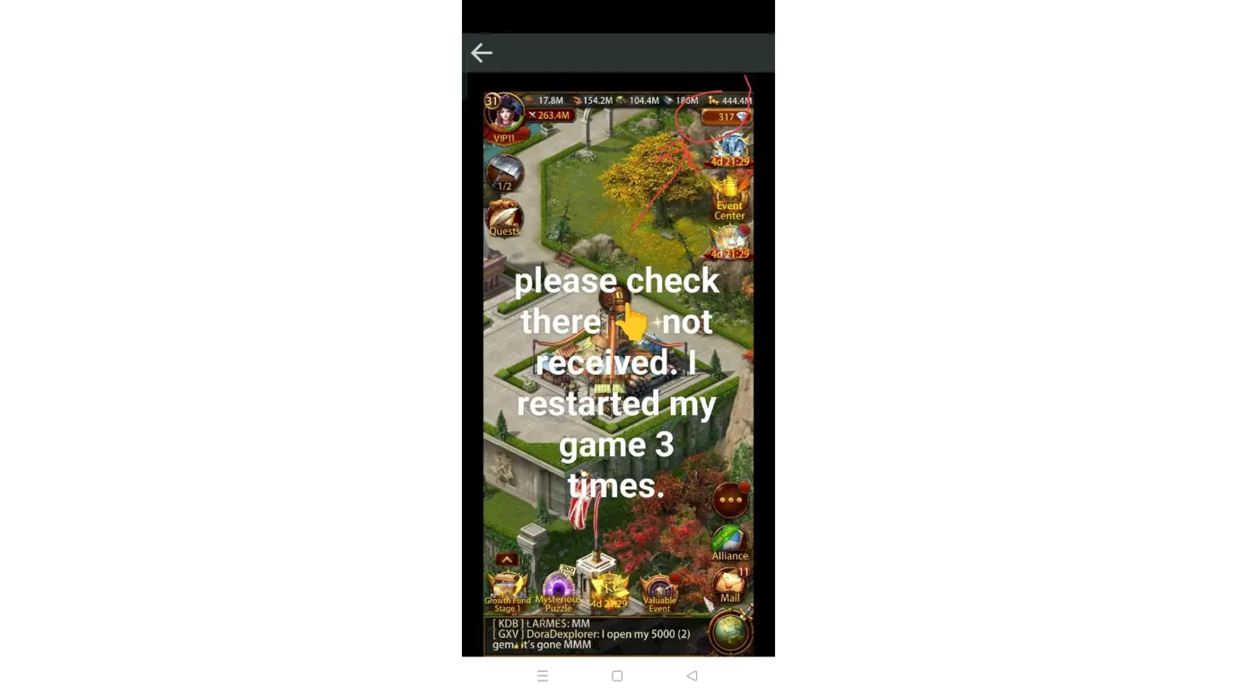 Just now I want to spend those gems in the black market, I opened two 5000 gems but I didn't receive it. Ive always complained some other things like missing stamina, losing some of my items like rss, stamina, early dropped of my bubble even it's not the time, didn't collect some barbarian flowers, and the event in Crawler but it's already finished the event still not received compensation They replied but not fixing the problem.