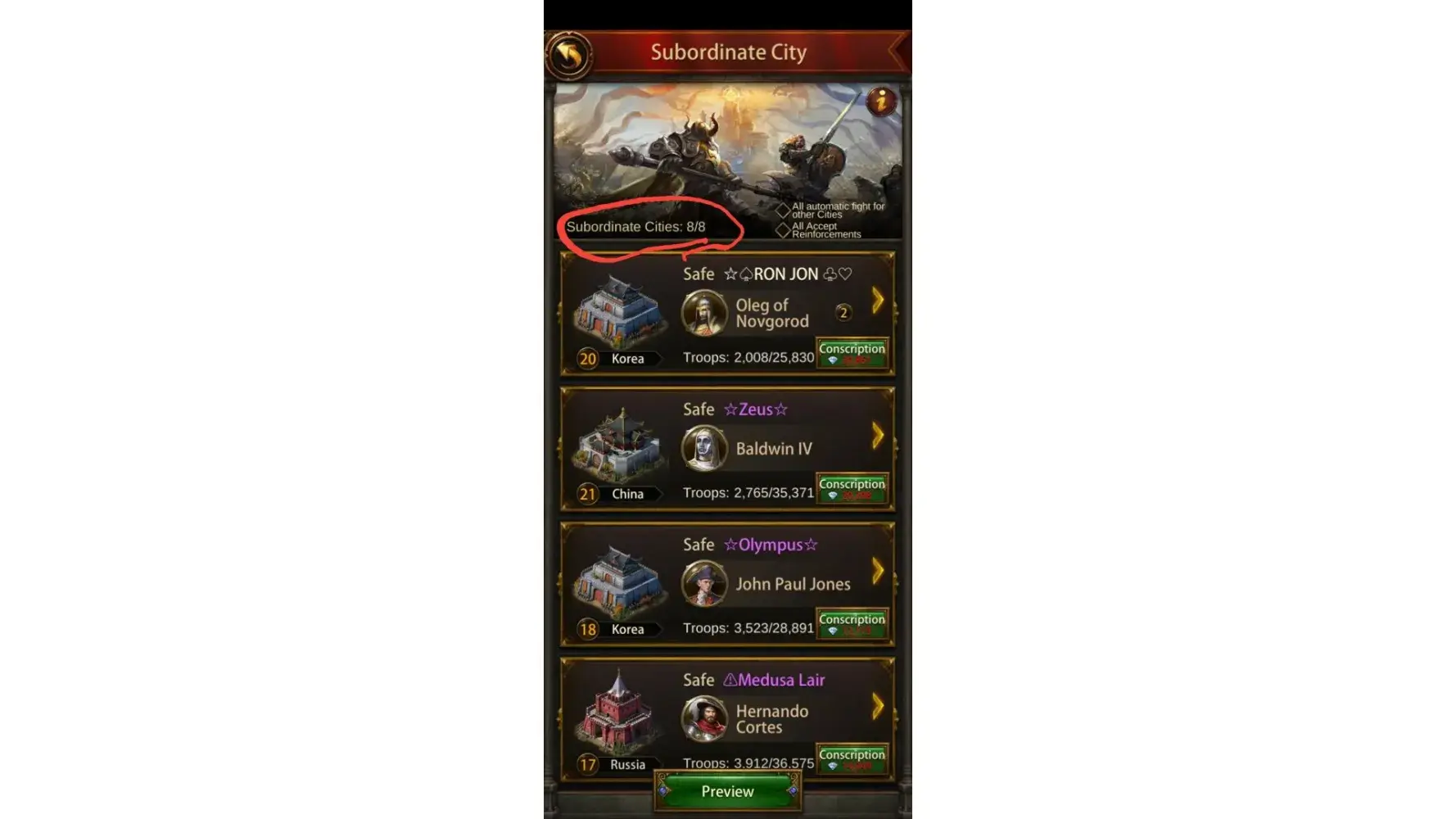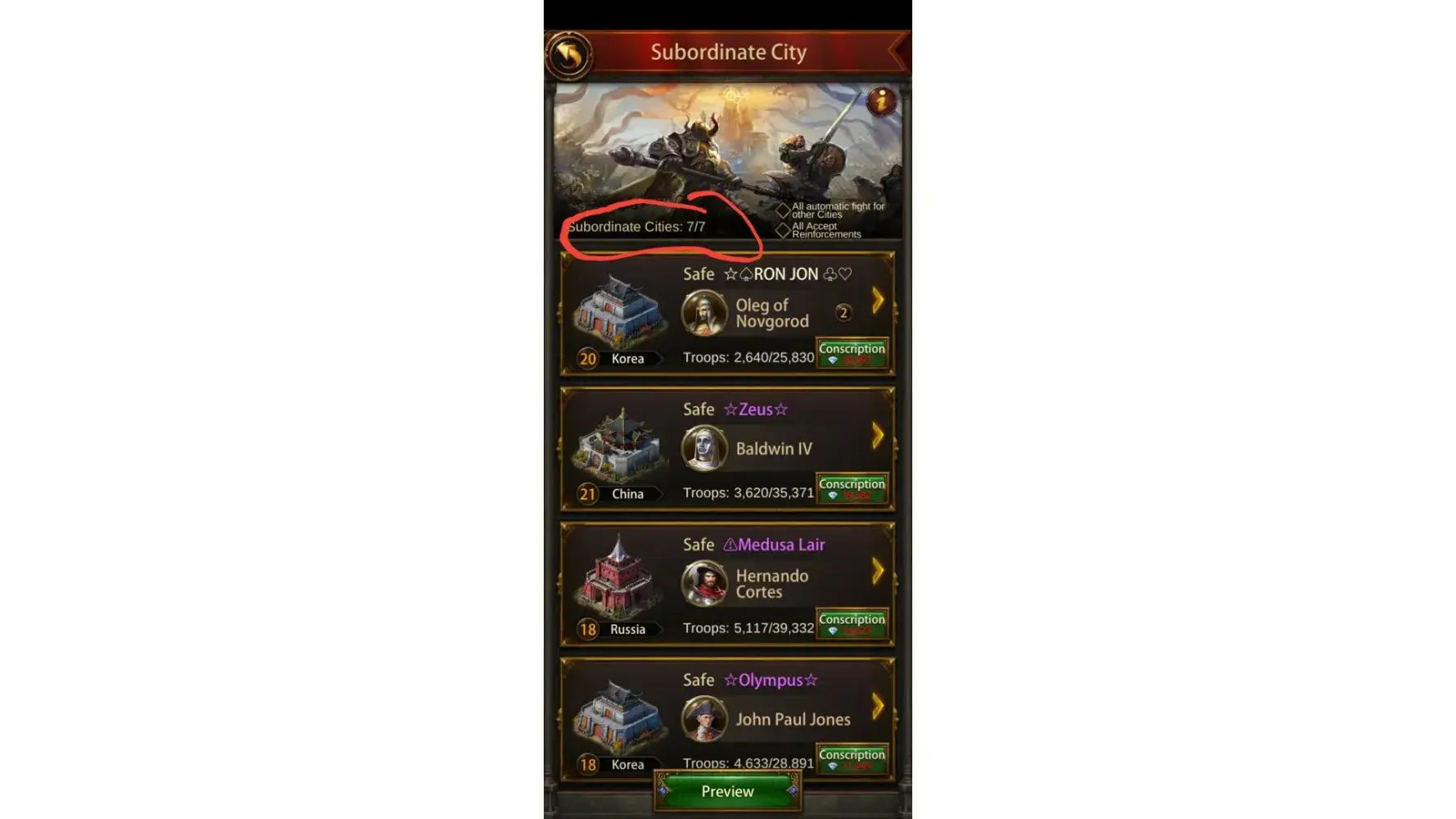 I have 8 slots to hold subordinate cities and played events weekly to win different subordinate city. I paid money to lose or win. So I finally won a subordinate city on July 24,2022. I wanted to switch a old subordinate city for the new subordinate city.