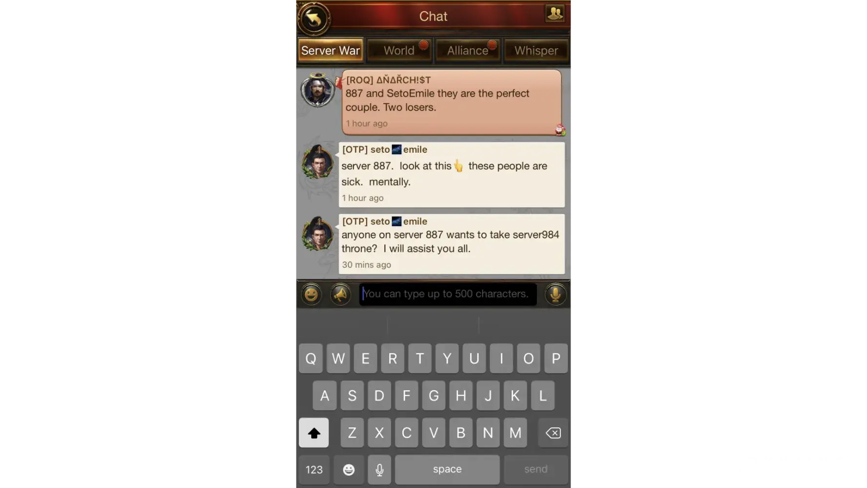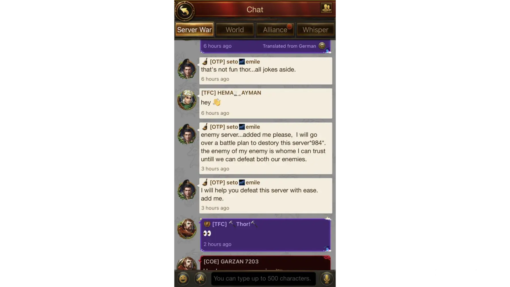 I play on server 1032. Two players have emerged that bully everyone on the server. They belittle and disrespect other players in world chat as well as destroy/ annihilate other players troops. Several alliances have tried to play with them, but even when we ally with these players, they eventually turn on everyone, zero them and make the game no fun for others. It seems they spend lots of money on game bonuses, but they use it to ruin the game for everyone else. Our server and the game in general are losing many players because of these two bullies. One player's name is Alan Yugo (just changed it to ì•„ë¼ë‰´ê³ ), the other is Yeon.