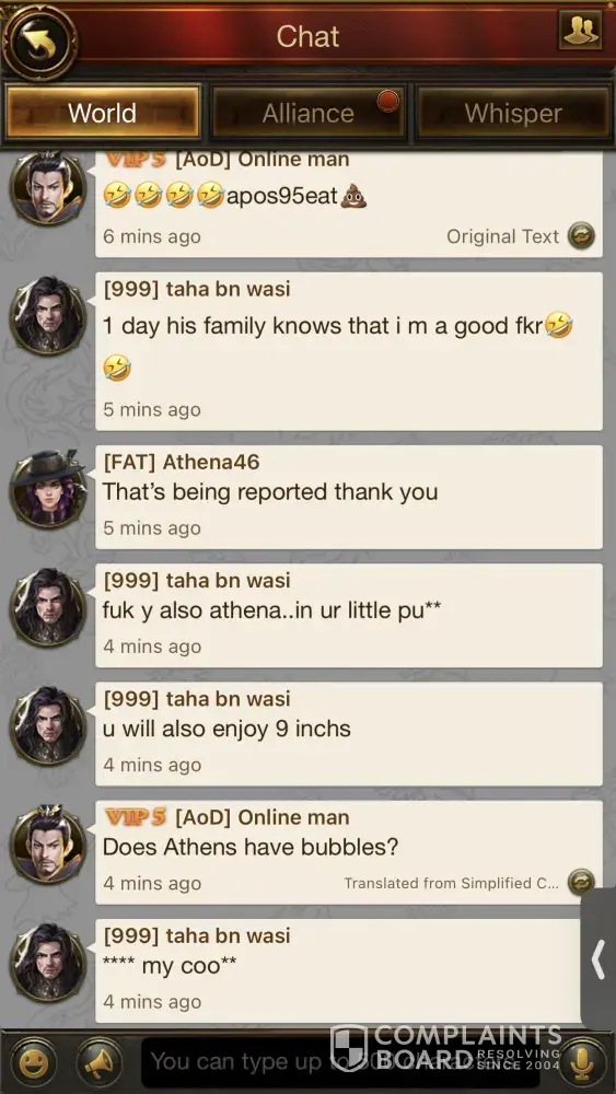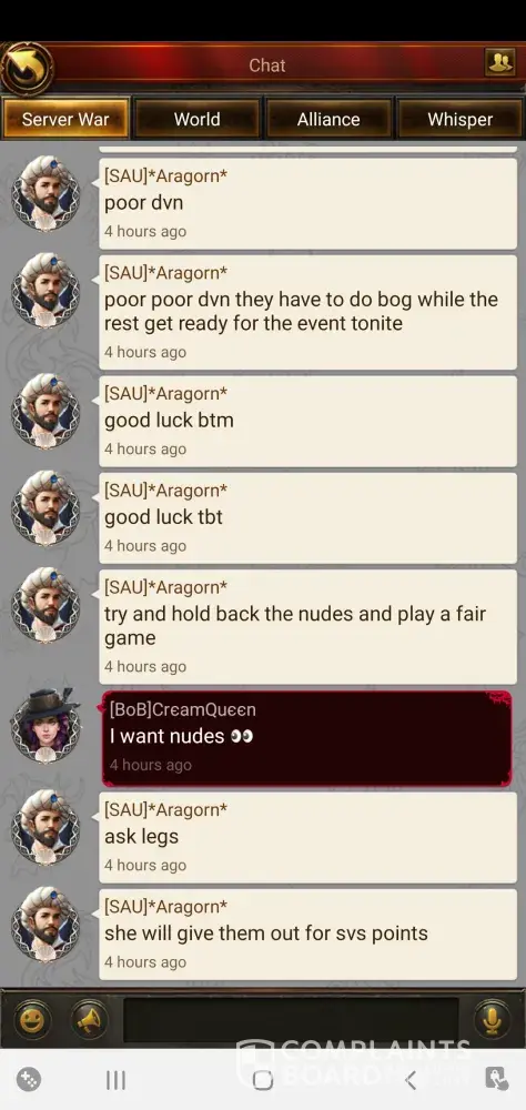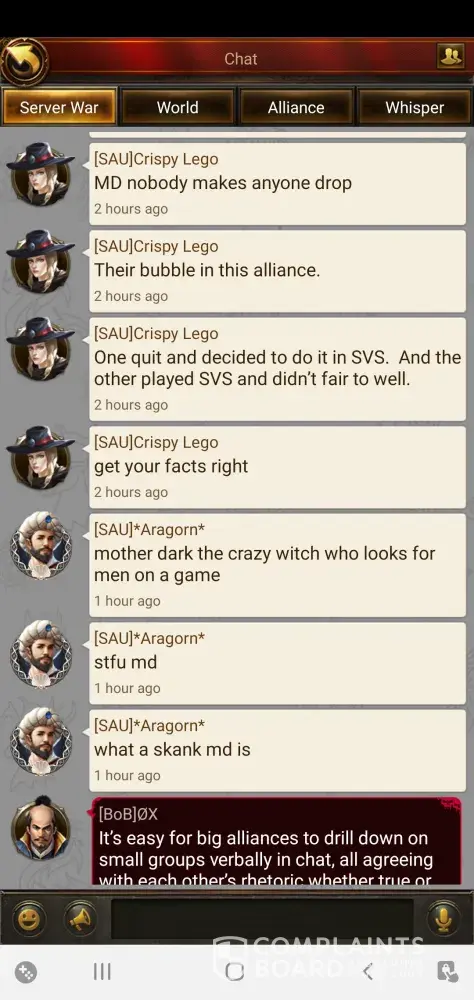 My alliance and many others in S100 have reported harassment and racial comments being made. Woman are now being harassed on a daily bases, the play gets muted for a week then returns to doing the same behavior over and over again. At this point he needs to be banned from his account and lose all access. I'm only going to attach 2 photos, however I have sent at least 50 to customer service and nothing happens. Other players have done the same. There are 2 players in the server that constantly harass and make racial comments especially towards women and this is not okay. I'm tired of reporting the issue and getting no where so now i will report on every site i can to get the problem out there. Customer service has tried muting and it only last week then we go back to the daily BS. ARAGORN ID# [protected]