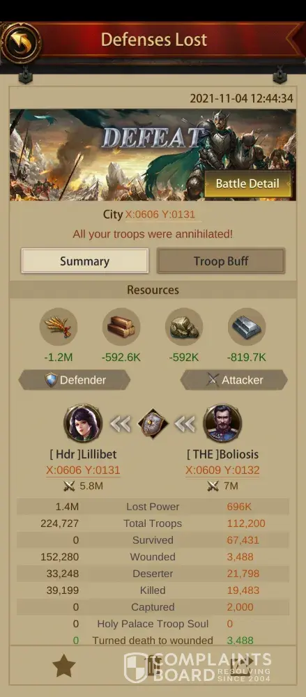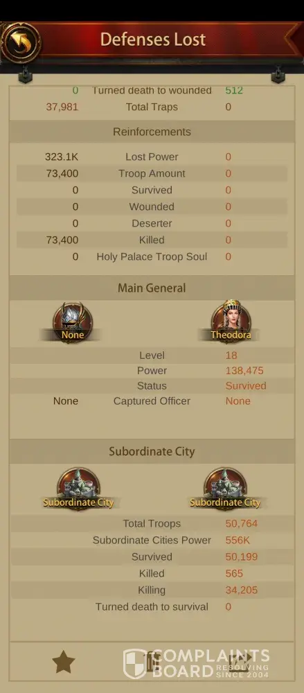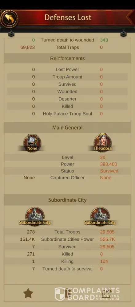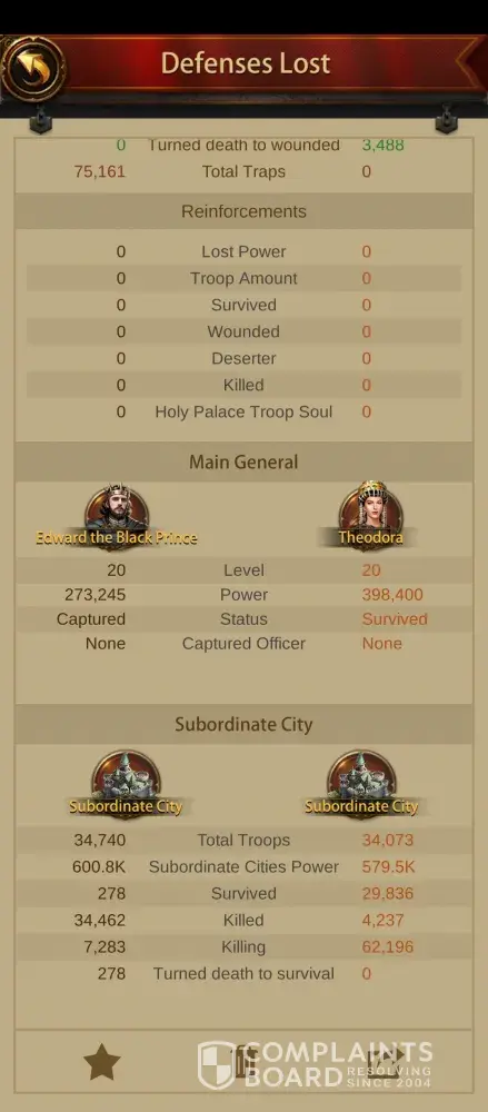 Besides losing hundreds of millions in resources to heal almost a million troops, a literal MOUNTAIN of Horns to recall deserters, and a load of Source of Life to resurrect lost troops, they also hit my Legendary Subordinate City (attached), and took it.