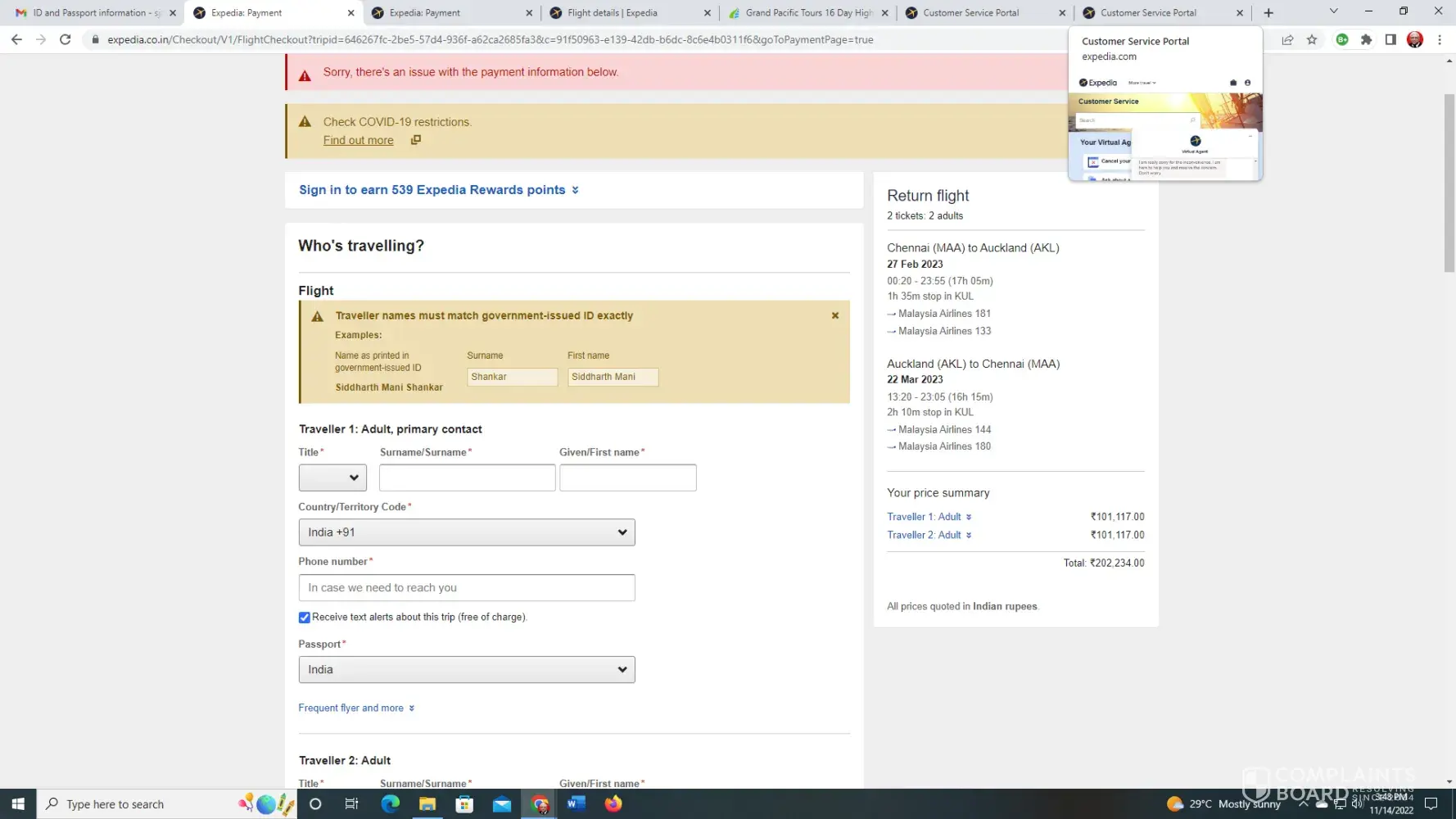 I am S. Janarshan, aged 71 and my colleague Mr. Sridharan is aged 75. We have been trying to book 2 return tickets chennai to auckland. The ticket cost was Rs.202234/-. Each time it gets rejected stating that "sorry there's an issue with the payment information below" I tried 4 different cards all of them having the necessary balances including my debit card. Your customer care number [protected] makes us go through various options and then says "No service available for this option and we will contact you as soons as it is revived" This reply is for internation bookings. I tried your chat. After great difficulty we got an agent on line but after a few questions he asked us to wait and simply disappeared. We waited for more than 10 minutes. Proof ob both given below as photos