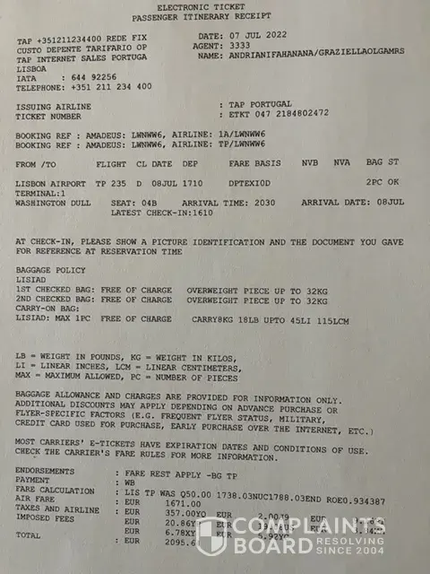 I purchased a flight in the amount of $648 dollars on February 6, 2020. The trip was from Rome ïƒ Newark under Itinerary No. [protected]. On the same date, another flight was purchased, for Anthony Giuliano under Itinerary No. [protected], also for $648, going from Rome ïƒ Newark. The flights were cancelled on April 22, 2020 and May 9, 2020, due to the ongoing COVID-19 pandemic. Specifically, Tap Portugal cancelled the departing flights to Italy, thus requiring the cancellation of the returning flights.