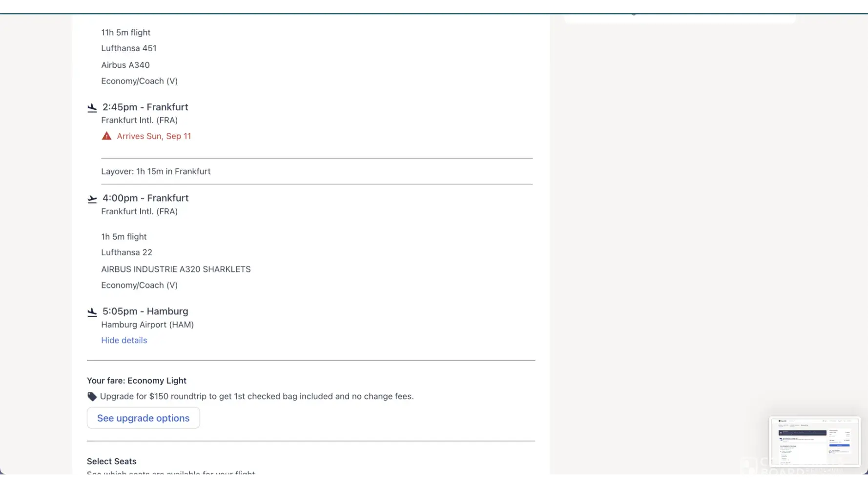 In 2022, I made a subsequent Lufthansa flight reservation via Expedia. The flight was to depart Frankfurt on 27 October 2022, Lufthansa flight LH1310 with a 1355 departure and an arrival time of 1625 in Malta. This was a business class flight with seats 8C and 8D being assigned to my wife and me. The flight had to be in the afternoon as we were arriving in Frankfurton on a morning flight.