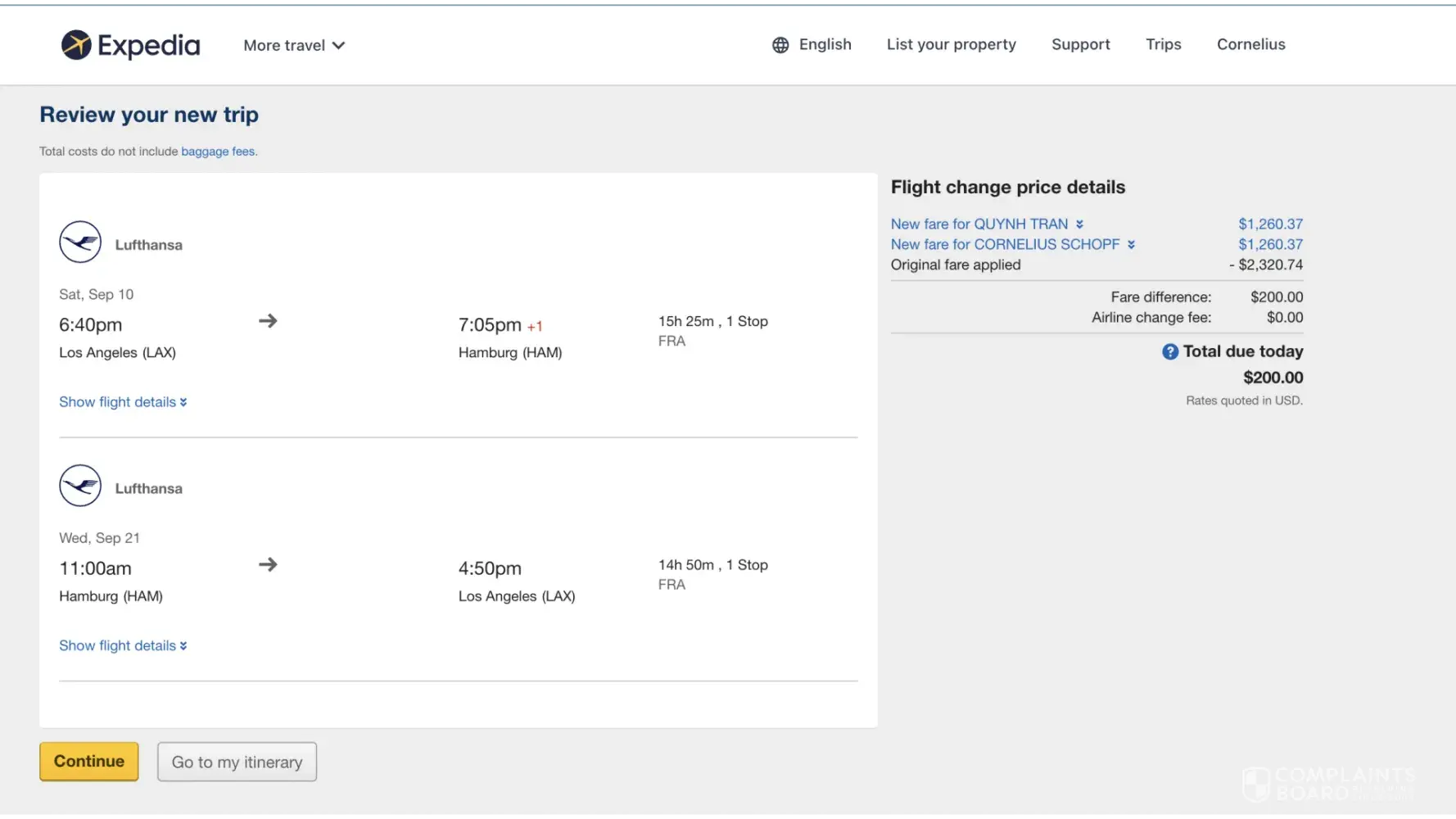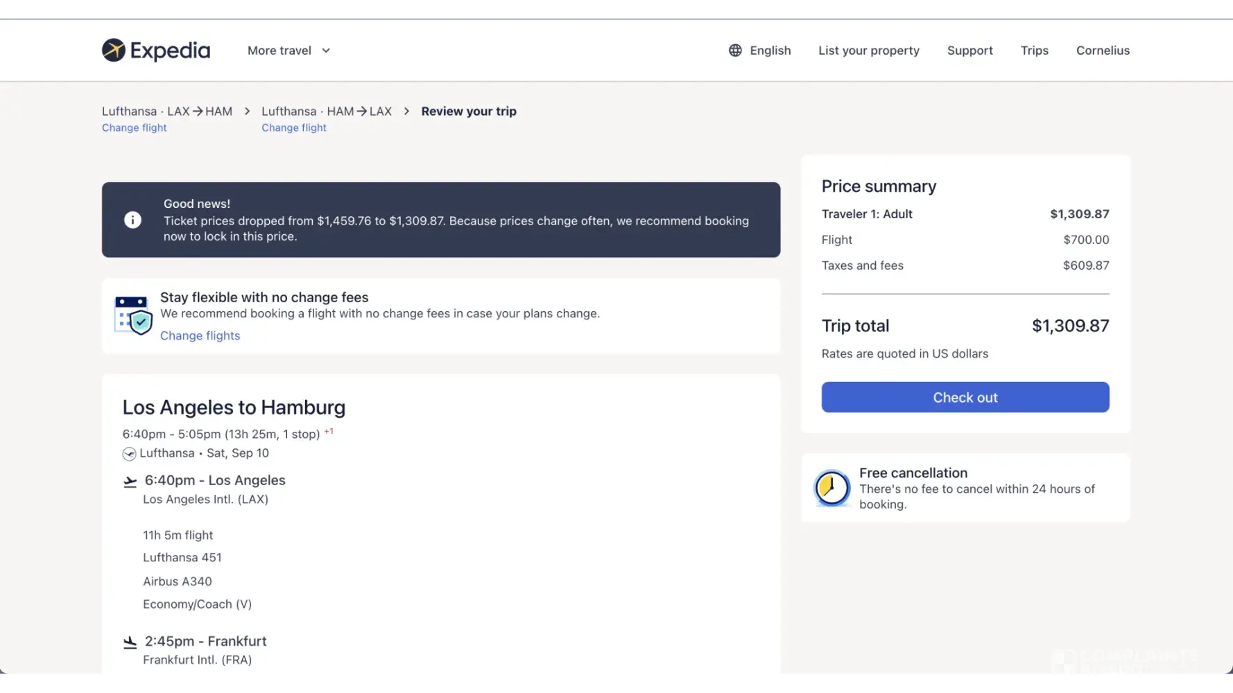 I booked 2 tickets on Expedia to fly with Lufthansa from LAX-FRA-HAM. I booked a higher priced ticket since my mother has medical issues and it says I can change the date if I pay the price difference if the airline has a different price for the dates selected.
