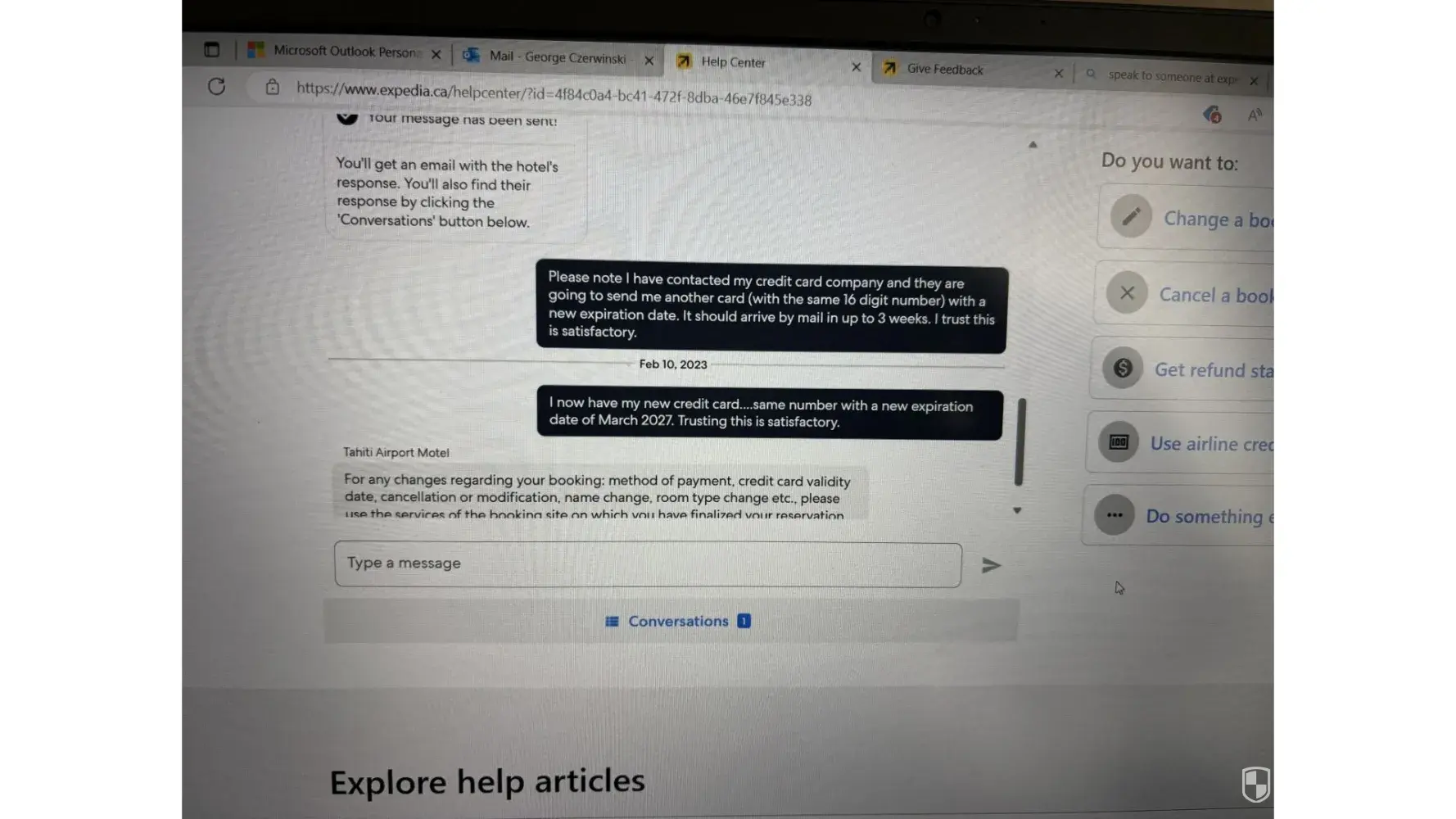 I booked the Motel on February 5 2023 for 4 people-2 rooms, and got a message back that my credit card was expiring in March 2023, well before the October 19 2023 stay at the Motel. Within a week I got my credit card company to issue a new card with a 2027 expiry date and I advised the motel and updated the Expedia site with the new Expiry date (the credit card number did not change) - see attached.