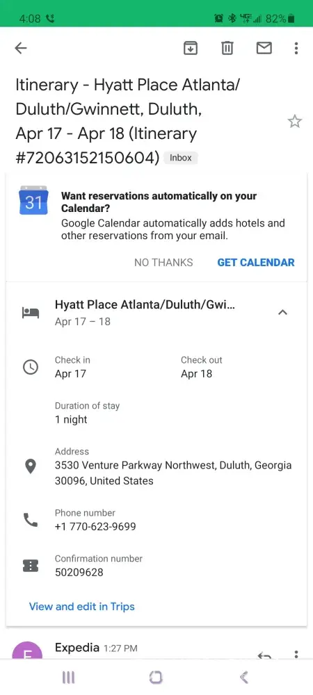 In February I booked for a one night stay at the Hyatt in GA for April 17th - 18th. I received a confirmation, [protected] (Travelocity) and [protected] (Expedia) and was informed the amount would be $111.25. On March 19th my card was charged $277.13 by the Hyatt hotel. I contacted the Hyatt hotel to figure out what was going on and was informed I was charged a 3 night stay, March 19 - March 22nd, even though I was not present "for a no show fee." They provided me a confirmation, [protected]. Two Hyatt hotel staff reported this stay was confirmed by Expedia and would need to be addressed by them. They also informed me that I was not booked for a one night stay for April 17th.