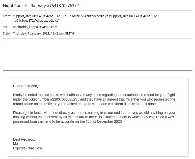 I booked a return flight ticket from Expedia.ca with onward journey scheduled on 17th August 2020 from Pune (India) to Vancouver (Canada) and inbound journey scheduled on 7th Feb 2021 from Vancouver (Canada) to Mumbai (India). They issued me a ticket for Lufthansa Airlines for CAD $1766. I travelled from Pune to Vancouver but recently my inbound journey...