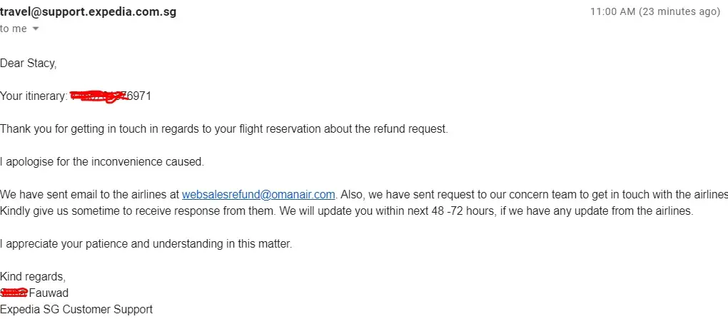 Till today, Expedia customer support is still asking me to give them 24-72 hours for them to send my refund request to Oman Air refund email address I provided to them.