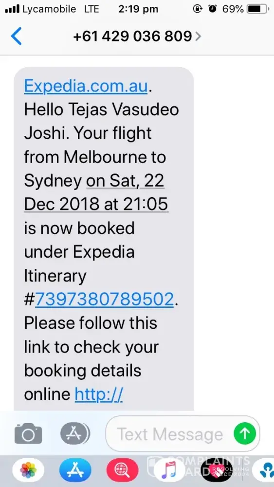 I have received incorrect text message on my phone number - [protected] regarding the booking. I chose the return ticket booking from Expedia website, from Melbourne to Sydney and from Sydney to Melbourne, but I just got booked for one way ticket from Sydney to Melbourne. and I did receive the text Message which says "Expedia.com.au