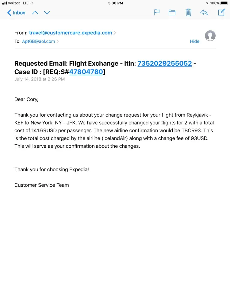 We were on a cruise ship that had an itinerary change in Iceland and I needed to change my departure date from August 12 to August 13. From the cruise ship I called Expedia on 7/14/18 and spoke to a man named Sean and after many attempts he was able to change my flights for the cost of $141.69 per ticket. To facilitate this, I was on the phone with Sean for 1 hour and 40 mins using expensive at-sea-wifi. But I was satisfied with the results because I received an email from Expedia immediately confirming the change had been made and my credit card had been charged. I went on the Icelandic Air site to make sure my flight had been changed to the new date. I even took a screen shot so I had the flight number, and the date and time handy.