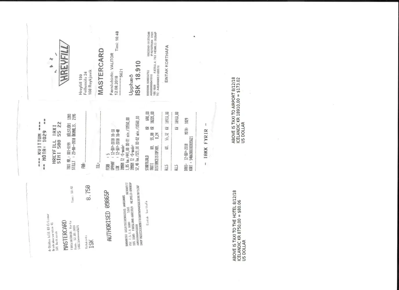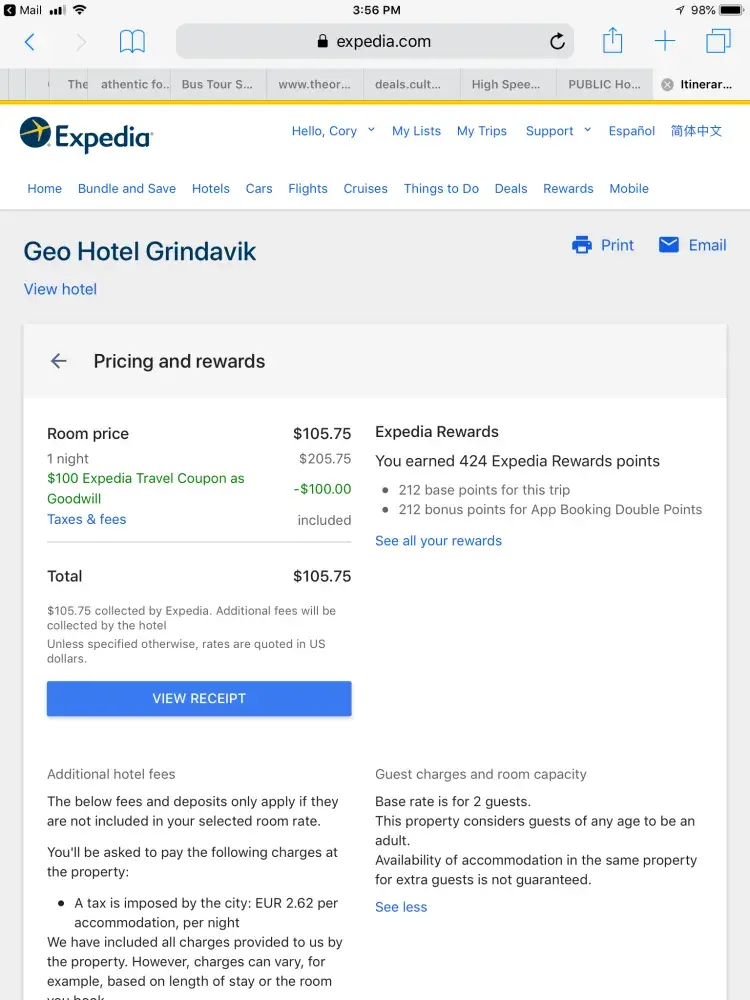 Thanks to Expedia we had an incredibly stressful and a completely ruined day in Reykjavík. I cannot emphasize enough how miserable we were. I believe once you review all the documents you will see that many mistakes were made and not by me. I expect to be reimbursed for the taxis and the hotel balance a total of $358.08.