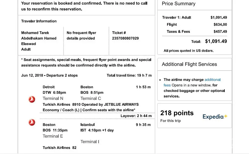 Below are the flight info and attached is the printed ticket from Expedia website.