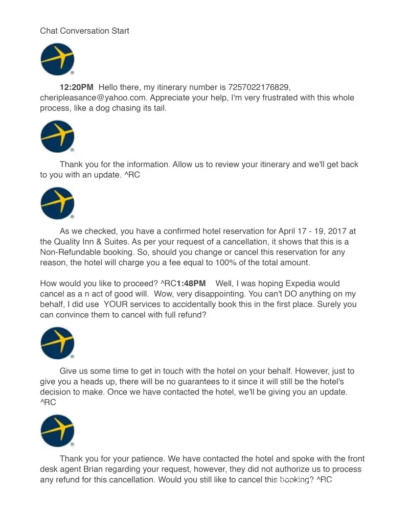 I sent tons of messages, but they ignored them all, and every time I called they asked me to wait on hold and then hang up. Beware of Expedia!